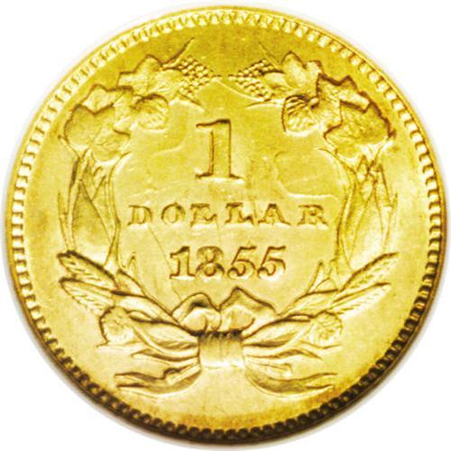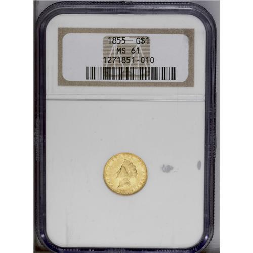 <B>1855<G$1> MS61 NGC.</B></I> Well struck with reasonably strong central definition, lacking only in the area of Liberty's hair. There are a few scattered field marks as well as the usually seen die clashing, but overall the coin is quite clean and problem-free with good luster characteristics.