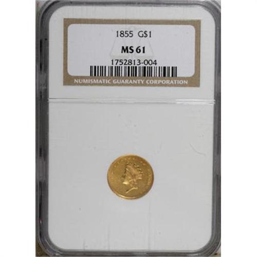 <B>1855 G$1 MS61 NGC.</B></I> Typically struck with weakness noted on LL and 18 in the date, as well as on the I in UNITED, which is completely missing. Satiny and a bit lackluster, but free of severe distractions on either side. Faint clash marks on the obverse and equally minor striations on the reverse are noted as interesting mint-made features of the coin. <BR><BR><B>Coin Engraver:</B> James B. Longacre<BR><BR><b>Shipping:</b> Coins & Currency (<a target="_blank" href="http://www.heritageauctions.com/common/shipping.php">view shipping information</a>\)