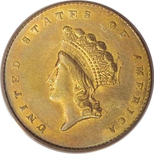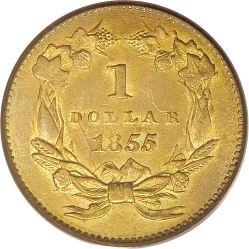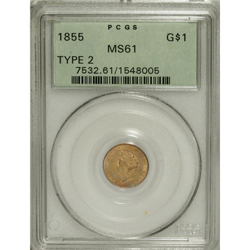 <B>1855 G$1 MS61 PCGS.</B></I> The 1854 and 1855 dates are popular for type sets to represent the elusive Type Two gold dollar variety. The surfaces alternate green in the open fields with orange tints in the protected areas around the periphery. Some faded clash marks are noted on each side, and the 5 in the date shows some of the expected weakness. While the moderate patina somewhat subdues the luster, there are few visible abrasions or other surface impairments noted, and the overall effect is pleasing. This coin is certified in a green-label holder.<BR><BR><b>Shipping:</b> Coins & Currency (<a target="_blank" href="http://www.heritageauctions.com/common/shipping.php">view shipping information</a>)