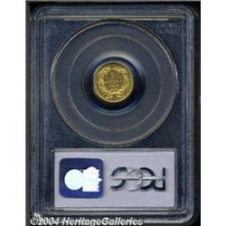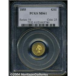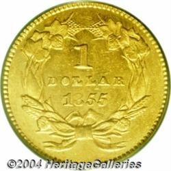 <B>1855<G$1> MS61 PCGS.</B></I> Second year of this short-lived and highly collectible gold type coin. The surfaces are lustrous throughout, surprisingly so for an MS61 coin. In this case, the coin derives its grade not from any lack of luster, but rather from the Mint-made problems that are present on most Type Two gold dollars, that is, softness of strike, very minor die clash marks, and a pronounced contact mark on Liberty's cheek on the obverse. Otherwise, a minimally abraded MS61 with good luster. <BR><BR><B>Important notice:</B> Heritage usually auctions material at the rate of 200-250 lots per hour. On some occasions eBay Live bid software or the Internet may not be able to keep up with the pace of the auction. We recommend placing a realistic absentee bid now as insurance to avoid disappointment. Occasionally the auctioneer may eliminate or reject an eBay Live bid, and the auctioneer may also reopen a lot after the close of the eBay live bidding (usually because we missed an audience bid), and may reject your bid even if it shows you as the winning bidder. By bidding via eBay Live, you agree that Heritage may award the lot to another bidder at its sole discretion under the circumstances described above or any other reasonable circumstances. Since eBay bids are not shown to us until we open the lot on the floor, we treat those bids just like floor bids. In most cases the floor responds before the eBay bid is presented to us, due to Internet lag time, so for consistency we have made it a policy that floor bids are always considered first over tie eBay live bids. Also please note that all Heritage lots purchased through eBay Live carry a 20% Buyer's Premium. Please make sure you read the Terms and Conditions before you bid. </span></font></tr></table></td></tr></table>