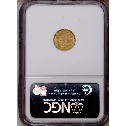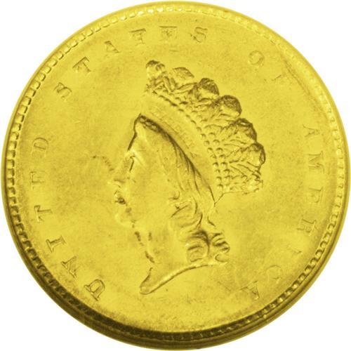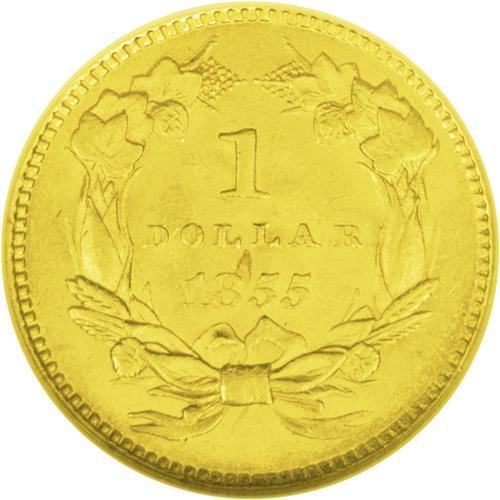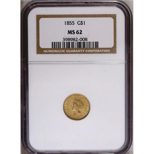 <B>1855<G$1> MS62 NGC.</B></I> A frosty Mint State example of this elusive, short-lived design type. The Small Indian Head design was executed in higher than normal relief, causing opposing weakness on the reverse. For this reason, the two middle date digits are almost invariably weak, although this example has these digits rather well defined. The surfaces are moderately abraded, yet display fully lustrous yellow-gold color.