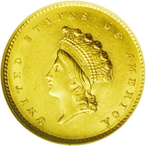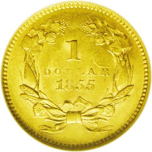 <B>1855<G$1> MS62 NGC.</B></I> Brilliant and frosty. Outstanding eye appeal for the grade. Struck from lightly clashed dies as is typical of many Type Two gold dollars seen. The letters LL in DOLLAR are softly defined, but most other design features are crisp. Type Two gold dollars were struck at the Philadelphia Mint only in the years 1854 and 1855, and accordingly, Uncirculated examples rank high in popularity with collectors.<BR><I>Ex: Jules Reiver Collection (Heritage, 1/2006), lot 21679.</B></I>