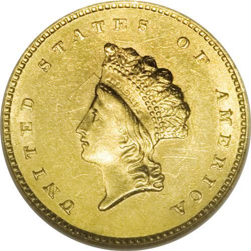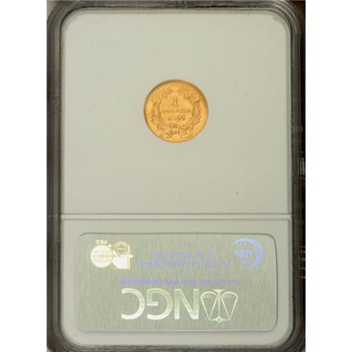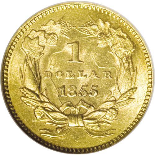 <B>1855 G$1 MS62 NGC.</B></I> This satiny Mint State piece has brilliant yellow-gold luster with sharp design features, including a strong date with only slight evidence of the usual weakness at the digit 8. Prominent clash marks are visible in the fields on both sides of this specimen.<BR><BR><b>Shipping:</b> Coin/Currency (<a target="_blank" href="http://www.heritageauctions.com/common/shipping.php">view shipping information</a>)