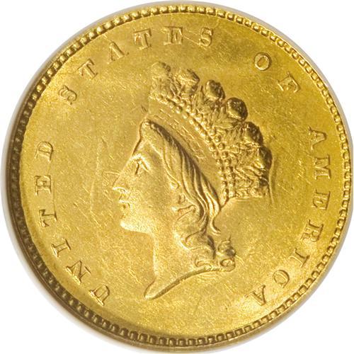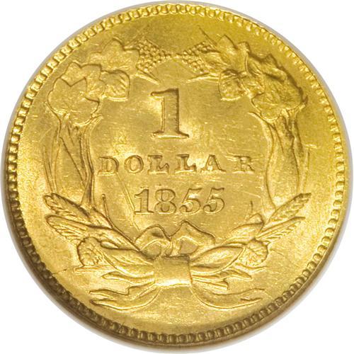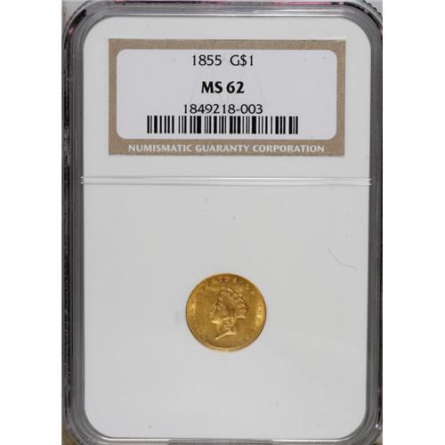 <B>1855 G$1 MS62 NGC.</B></I> This softly lustrous yellow-orange example exhibits only light marks that have minimal impact on the overall eye appeal. Struck from clashed dies that had been lapped, evident in the incomplete hair at Liberty's neck. A pleasing example of this short-lived type, from one of only two issues readily available of type collectors.<BR><BR><b>Shipping:</b> Coins & Currency (<a target="_blank" href="http://www.heritageauctions.com/common/shipping.php">view shipping information</a>)