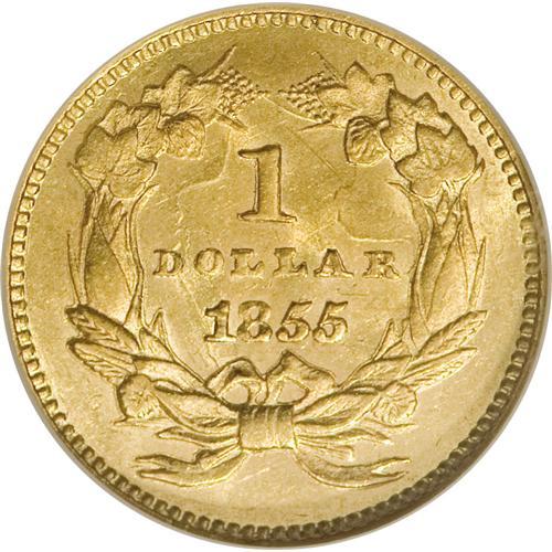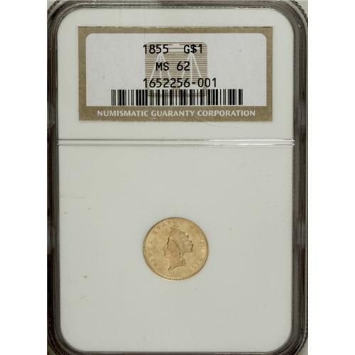 <B>1855 G$1 MS62 NGC.</B></I> A miscalculation doomed Longacre's initial design for the Large Diameter, Small Head gold dollar. The relief was too high, which caused the indistinct central details seen on most examples, though not the present piece. This Mint State 1855 dollar is an excellent example of this three-year type. The shimmering amber-gold fields have just a few wispy abrasions, and the overall detail is as strong as the visual appeal.<BR><BR><b>Shipping:</b> Coins & Currency (<a target="_blank" href="http://www.heritageauctions.com/common/shipping.php">view shipping information</a>)