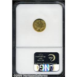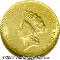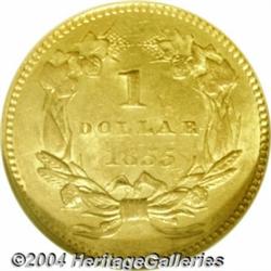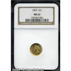 <B>1855<G$1> MS62 NGC.</B></I> The short-lived Type Two Gold Dollar is certainly one of the most popular designs in 19th century U.S. coinage. This example is well struck for the type and displays smooth mint frost over each side. Lightly abraded with just the slightest trace of die clashing in the fields. <BR><BR><B>Important notice:</B> Heritage usually auctions material at the rate of 200-250 lots per hour. On some occasions eBay Live bid software or the Internet may not be able to keep up with the pace of the auction. We recommend placing a realistic absentee bid now as insurance to avoid disappointment. Occasionally the auctioneer may eliminate or reject an eBay Live bid, and the auctioneer may also reopen a lot after the close of the eBay live bidding (usually because we missed an audience bid), and may reject your bid even if it shows you as the winning bidder. By bidding via eBay Live, you agree that Heritage may award the lot to another bidder at its sole discretion under the circumstances described above or any other reasonable circumstances. Since eBay bids are not shown to us until we open the lot on the floor, we treat those bids just like floor bids. In most cases the floor responds before the eBay bid is presented to us, due to Internet lag time, so for consistency we have made it a policy that floor bids are always considered first over tie eBay live bids. Also please note that all Heritage lots purchased through eBay Live carry a 20% Buyer's Premium. Please make sure you read the Terms and Conditions before you bid. </span></font></tr></table></td></tr></table>