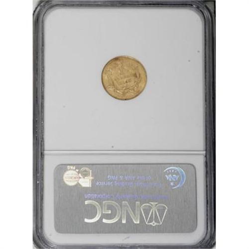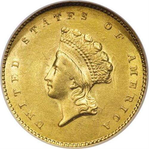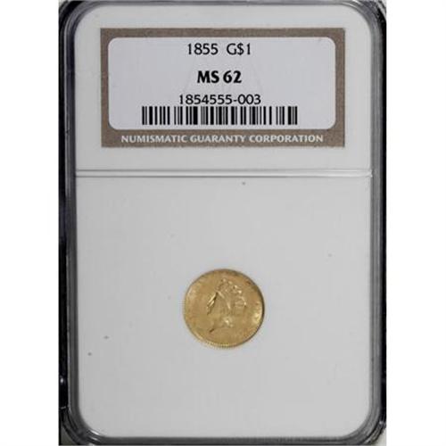 <B>1855 G$1 MS62 NGC.</B></I> Many 1855 gold dollars are weakly struck, especially the central portions of the reverse. The MS62 specimen presented in this lot is well defined over most of the design elements, save for a touch of softness in the top of the 8 in the date. Peach-gold lustrous surfaces reveal just a few minor luster grazes, as well as clash marks on each side.<BR><BR><b>Shipping:</b> Coins & Currency (<a target="_blank" href="http://www.heritageauctions.com/common/shipping.php">view shipping information</a>)