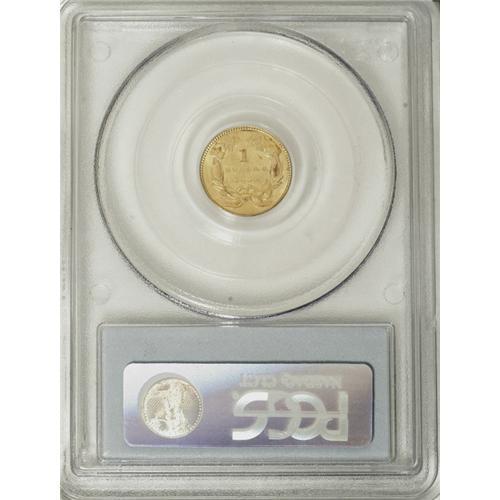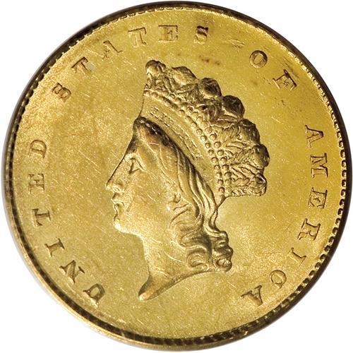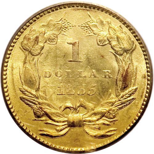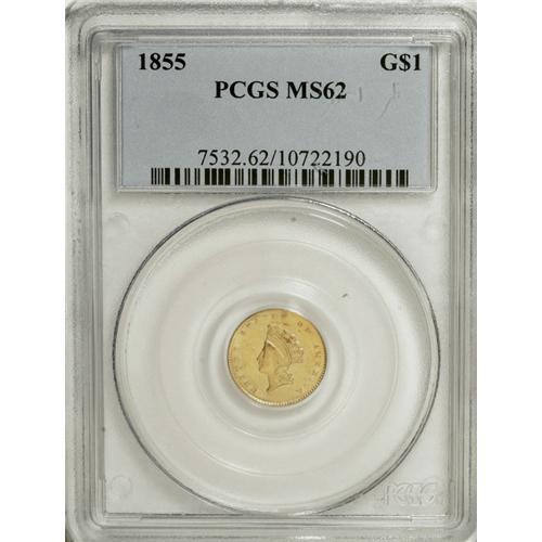 <B>1855 G$1 MS62 PCGS.</B></I> An almond-gold representative of this scarce Small Indian Head type. The highpoints have an occasionally hint of ruby-red toning. A few minor marks on the portrait are only apparent beneath a glass. Interesting radial reverse die cracks at 12, 3, and 8 o'clock merge between the LL in DOLLAR.<BR><BR><b>Shipping:</b> Coins & Currency (<a target="_blank" href="http://www.heritageauctions.com/common/shipping.php">view shipping information</a>)
