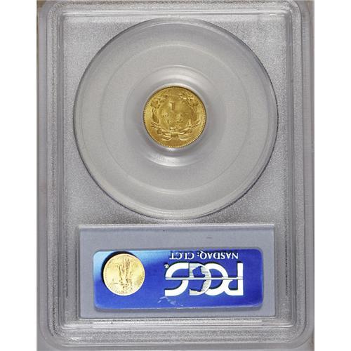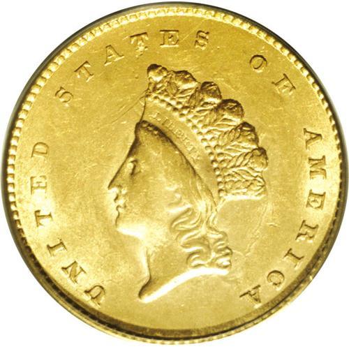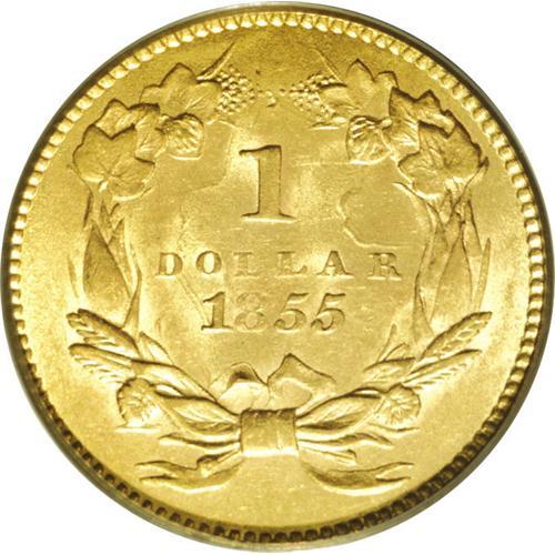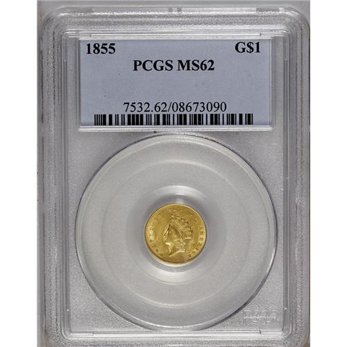 <B>1855<G$1> MS62 PCGS.</B></I> Bold clash marks show on each side of this attractive Type Two gold dollar, which boasts good luster and greenish-gold surfaces. The 8 and LL in the center reverse are weak, as often seen, and there is a small dig at the base of the first T in STATES.