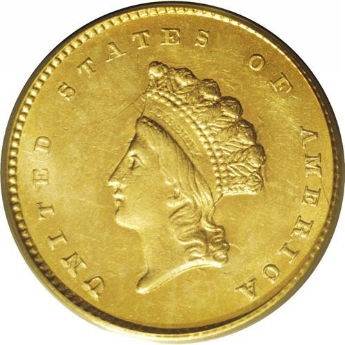 <B>1855<G$1> MS62 PCGS.</B></I> Overall bold in striking detail, the orange-gold surfaces are remarkably free of sizeable distractions for the MS62 grade, save for one thin scratch mark from the O of DOLLAR to the upper inside of the wreath. Conditionally scarce, and important for Mint State type purposes. <BR><BR><B>Important notice:</B> Heritage usually auctions material at the rate of 200-250 lots per hour. On some occasions eBay Live bid software or the Internet may not be able to keep up with the pace of the auction. We recommend placing a realistic absentee bid now as insurance to avoid disappointment. Occasionally the auctioneer may eliminate or reject an eBay Live bid, and the auctioneer may also reopen a lot after the close of the eBay live bidding (usually because we missed an audience bid), and may reject your bid even if it shows you as the winning bidder. By bidding via eBay Live, you agree that Heritage may award the lot to another bidder at its sole discretion under the circumstances described above or any other reasonable circumstances. Since eBay bids are not shown to us until we open the lot on the floor, we treat those bids just like floor bids. In most cases the floor responds before the eBay bid is presented to us, due to Internet lag time, so for consistency we have made it a policy that floor bids are always considered first over tie eBay live bids. Also please note that all Heritage lots purchased through eBay Live carry a 20% Buyer's Premium. Please make sure you read the Terms and Conditions before you bid. This lot is being auctioned in conjunction with a live floor auction by Heritage Galleries & Auctioneers. All final auction and invoice information will be supplied by Heritage Galleries & Auctioneers, and all other information should be considered preliminary. Lot:2282 <BR><BR><B>Winning Notification and Billing:</B> After the FINAL session in this auction is complete, Heritage will send e-mail and snail mail invoices. This process normally takes several days. All final auction and invoice information will be supplied by Heritage Galleries & Auctioneers, and all other information should be considered preliminary. <BR><BR>This auction will be conducted on a live auction floor and over the Internet through eBay Live. If you choose to place an absentee bid, please take a moment to <font color='#0000ff'><u><a href='http://pages.ebay.com/liveauctions/help/before/laabsentee.html'>learn how eBay Live absentee bidding works</a></u></font><font color='#000000'>