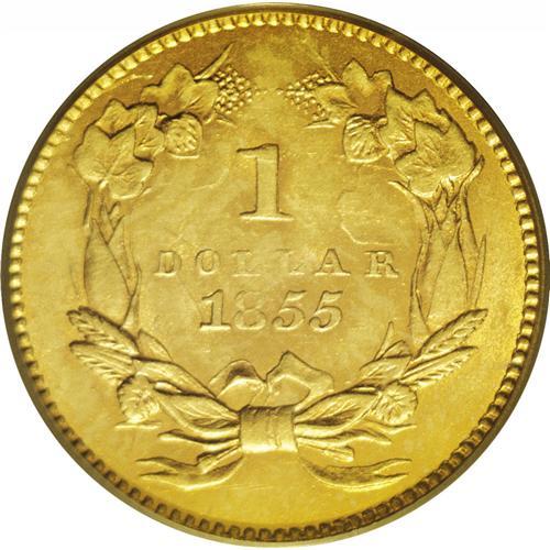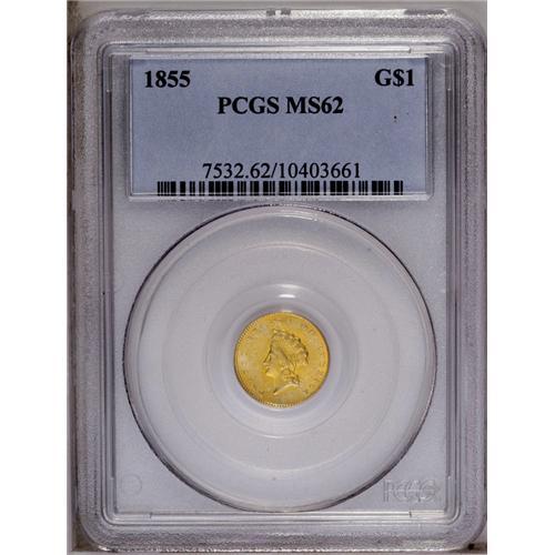 1855 G$1 MS62 PCGS. Overall bold in striking detail, t