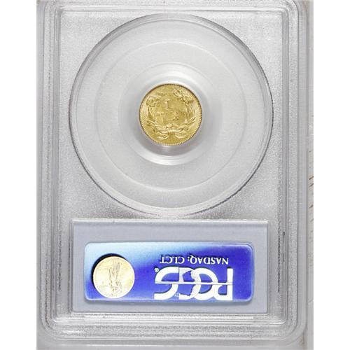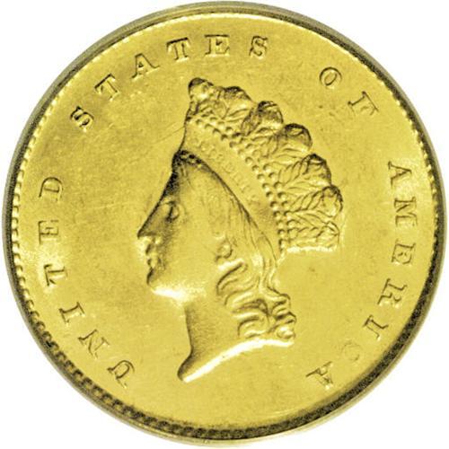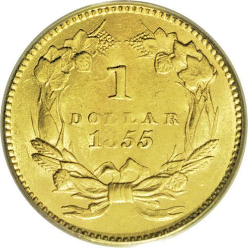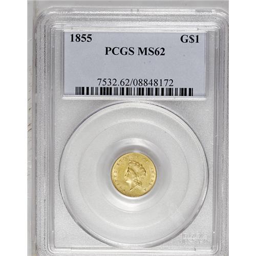<B>1855<G$1> MS62 PCGS.</B></I> Satiny-textured surfaces with pleasing color for this conditionally elusive type. There is noticeable die clashing on the reverse and weakness in the 8 of the date. Type Two gold dollars were struck at the Philadelphia Mint for only two years, 1854 and 1855, and accordingly, Uncirculated examples rank high in popularity with collectors.