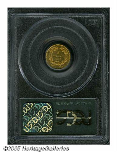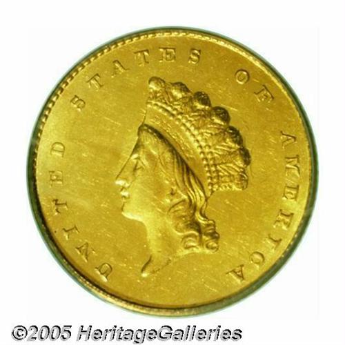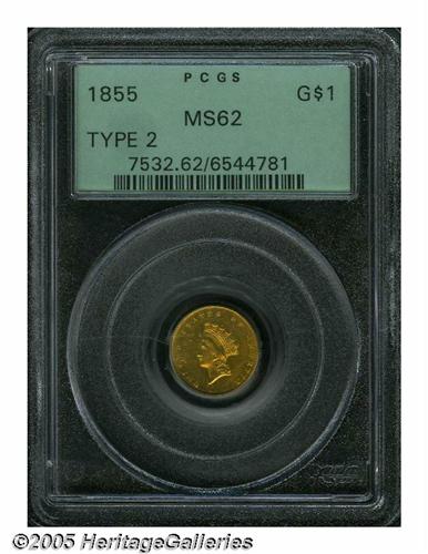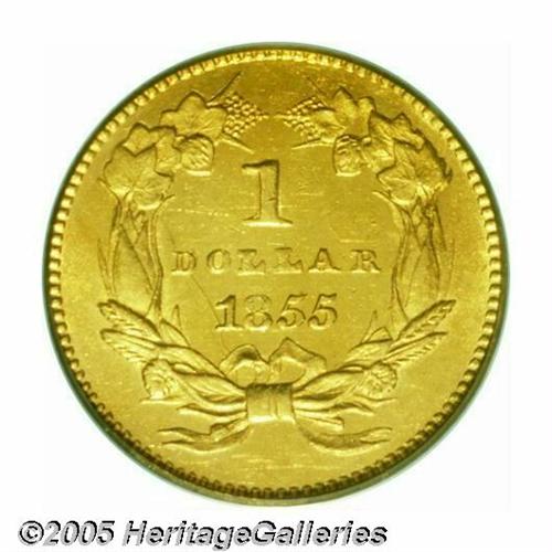 <B>1855<G$1> MS62 PCGS.</B></I> This is an unusual example with brilliant orange-gold color, rather than the usual greenish-gold appearance. It is sharply struck with nearly full details on both sides. A few hair strands on the obverse, as well as the digit 8 on the reverse, are slightly weak. The surfaces are reflective and almost prooflike in appearance. Light clash marks are seen on both sides.