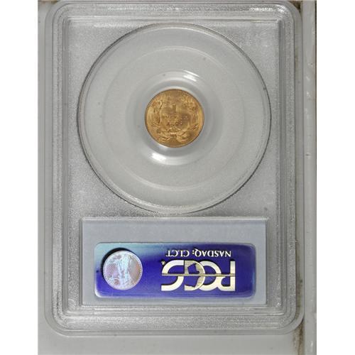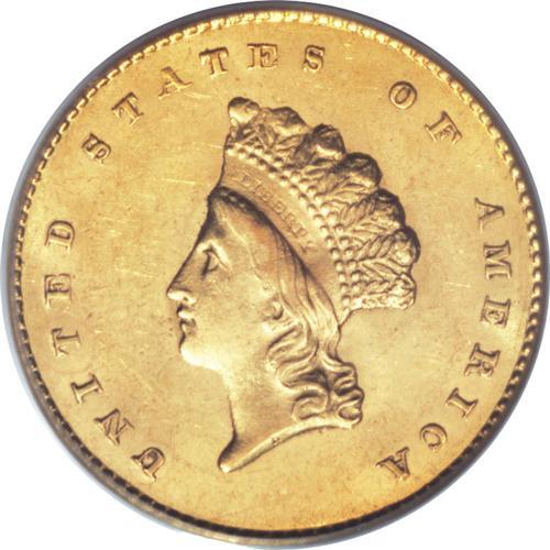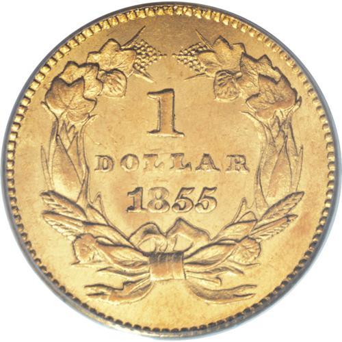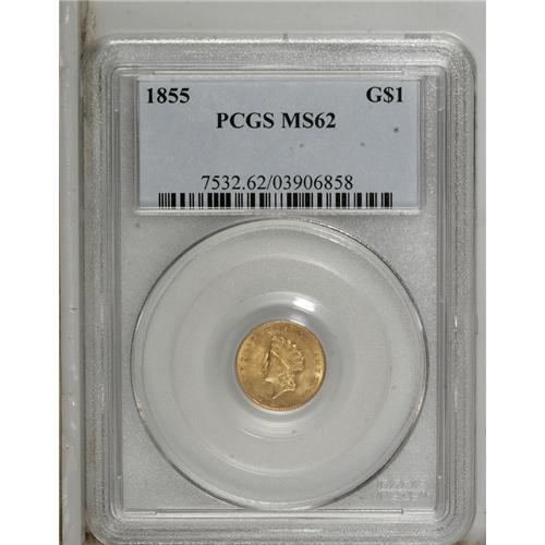 <B>1855 G$1 MS62 PCGS.</B></I> Type Two gold dollars are generally not found in Uncirculated grades, but we have a surprising group of such coins in this auction. This is a particularly attractive coin that has pleasing mint luster and good striking definition. The center of the reverse shows evidence of light die striations--an obvious attempt to efface the die clashing on that side, a striking characteristic usually seen on this type. Attractive medium orange-gold color.<BR><BR><b>Shipping:</b> Coins & Currency (<a target="_blank" href="http://www.heritageauctions.com/common/shipping.php">view shipping information</a>)