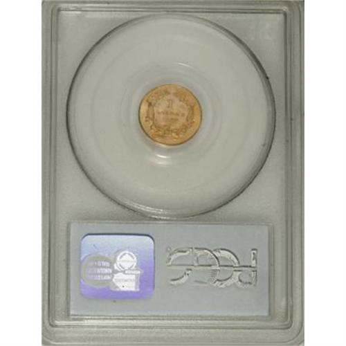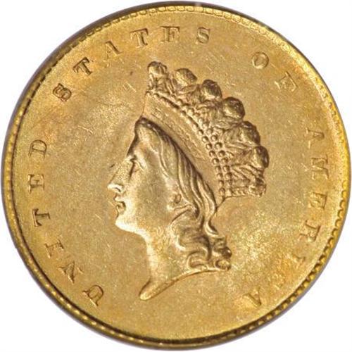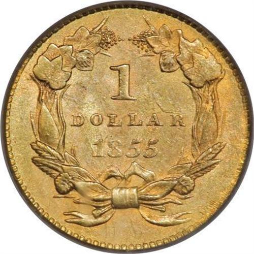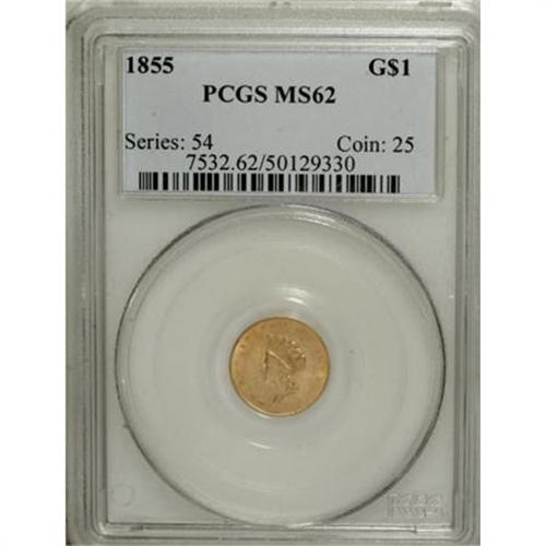 <B>1855 G$1 MS62 PCGS.</B></I> Light clash marks are only visible on the reverse of this example, a lustrous and attractive light yellow-gold representative of the popular Type Two or Small Indian Head design. A few faint hairlines and minor surface marks are visible on each side, consistent with the grade.<BR><BR><B>Coin Engraver:</B> James B. Longacre<BR><BR><b>Shipping:</b> Coins & Currency (<a target="_blank" href="http://www.heritageauctions.com/common/shipping.php">view shipping information</a>)