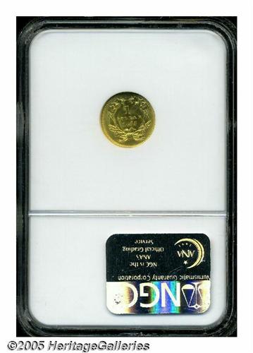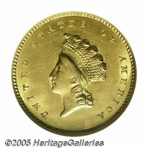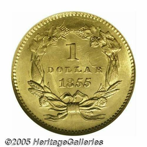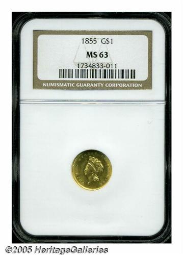 <B>1855<G$1> MS63 NGC.</B></I> For the collector who has been seeking an example of this issue, the present sale offers a wide array of different examples in a similarly wide array of quality. This example provides an excellent combination of value and quality. A few faint lines and abrasions are consistent with the grade. The surfaces have brilliant and frosty yellow-gold luster. Some central weakness is typical of nearly every known example of this design type, from a characteristic flaw in the layout of obverse and reverse design elements. Both obverse and reverse are clash marked as usual.
