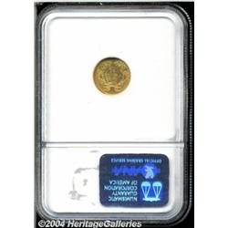 <B>1855<G$1> MS63 NGC.</B></I> While always available for a price in lower (circulated) grades, the Type Two Gold Dollar is a rare and highly desirable type coin in Mint State. At the MS63 level it is very elusive and of the greatest importance to gold collectors. This piece is very well struck although some of the central softness shows at the center of the reverse. Bright orange-gold color with sparkling mint luster, there are only a few small abrasions scattered about, none of which are of individual importance. Notable typical die clashing is seen overall. <BR><BR><B>Important notice:</B> Heritage usually auctions material at the rate of 200-250 lots per hour. On some occasions eBay Live bid software or the Internet may not be able to keep up with the pace of the auction. We recommend placing a realistic absentee bid now as insurance to avoid disappointment. Occasionally the auctioneer may eliminate or reject an eBay Live bid, and the auctioneer may also reopen a lot after the close of the eBay live bidding (usually because we missed an audience bid), and may reject your bid even if it shows you as the winning bidder. By bidding via eBay Live, you agree that Heritage may award the lot to another bidder at its sole discretion under the circumstances described above or any other reasonable circumstances. Since eBay bids are not shown to us until we open the lot on the floor, we treat those bids just like floor bids. In most cases the floor responds before the eBay bid is presented to us, due to Internet lag time, so for consistency we have made it a policy that floor bids are always considered first over tie eBay live bids. Also please note that all Heritage lots purchased through eBay Live carry a 20% Buyer's Premium. Please make sure you read the Terms and Conditions before you bid.