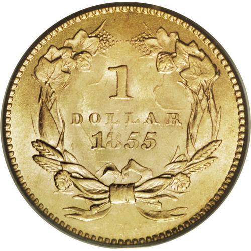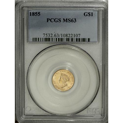 <B>1855 G$1 MS63 PCGS.</B></I> Dazzling luster illuminates this meticulously struck and carefully preserved representative. Any Type Two gold dollar is under substantial type set demand, but an exemplary piece, such as the present coin, is liable to cause a bidding war during its auction. Struck from boldly clashed dies.<BR><BR><b>Shipping:</b> Coin/Currency (<a target="_blank" href="http://www.heritageauctions.com/common/shipping.php">view shipping information</a>)