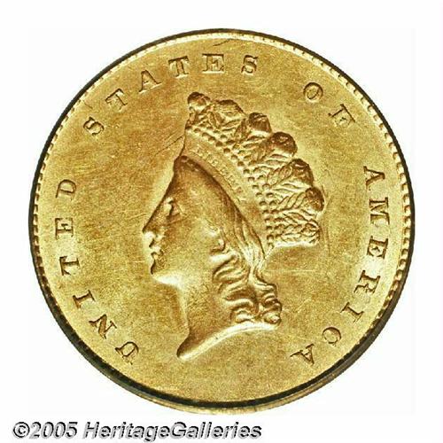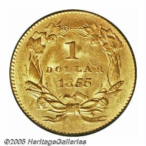 <B>1855<G$1> MS63 PCGS.</B></I> There are only six issues in the Type Two Gold Dollar series: 1854, 1855, 1855-C, 1855-D, 1855-O, and 1856-S. The work of James Barton Longacre, this design proved exceptionally difficult to produce. As the coins left the Mint with poorly defined features, it is little wonder that most specimens wore down quickly in circulation. Like the 1854 Type Two, the 1855 is always in demand for Mint State type purposes. Both sides of this coin are fairly well struck with some softness of the 8 in the date. Rich reddish-gold patina dominates the outward appearance, but isolated areas of softer golden-rose color are intermingled on the obverse. The often-seen clashmarks are noted in the fields, but the surfaces are free of most sizeable abrasions. A pleasingly original specimen.