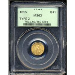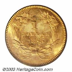 <table><tr><td><TABLE cellSpacing=0 cellPadding=0 width="100%" bgColor=#000000 border=0><TBODY> <TR><TD width="100%"><TABLE cellSpacing=1 cellPadding=3 width="100%" border=0><TBODY><TR><TD width="100%" bgColor=#79735c><FONT face=arial color=#ffffff size=3><B>Description</B> </FONT></TD></TR><TR><TD width="100%" bgColor=#ffffff><FONT face=arial size=2><B>1855 G$1 MS63 PCGS.</B></I> Lemon-gold patina graces this lustrous Type Two example. Liberty's profile is only faintly die clashed (as made) into the central reverse, and the strike is bold aside from the 8 in the date. A few wispy slide marks are noted on the lower obverse, while the reverse has a pleasing appearance.<BR><I>From the Holman Family Collection.</B></I> </FONT></TD></TR></TBODY></TABLE></TD></TR></TBODY></TABLE><BR><A name=PricesRealized></A><TABLE cellSpacing=0 cellPadding=0 width="100%" bgColor=#000000 border=0><TBODY><TR><TD width="100%"><TABLE cellSpacing=1 cellPadding=3 width="100%" border=0><TBODY><TR><TD width="100%" bgColor=#79735c><A name=PR><FONT face=arial color=#ffffff size=3><B>Previous Prices from Heritage Auctions</B> </FONT></A></TD></TR><TR><TD bgColor=#f6f6ed><TABLE cellSpacing=0 cellPadding=0 width="100%" border=1><TBODY><TR><TD align=middle width="33%"><B>Date</B></TD><TD align=middle width="33%"><B>Service</B></TD><TD align=middle width="33%"><B>Price</B></TD></TR><TR bgColor=whitesmoke><TD width="33%"><B>05/31/2003</B></TD><TD width="33%">PCGS</TD><TD width="33%">$10,235.00</TD></TR><TR bgColor=whitesmoke><TD width="33%"><B>01/05/2001</B></TD><TD width="33%">PCGS</TD><TD width="33%">$8,625.00</TD></TR><TR bgColor=whitesmoke><TD width="33%"><B>06/06/1998</B></TD><TD width="33%">PCGS</TD><TD width="33%">$18,400.00</TD></TR><TR bgColor=whitesmoke><TD width="33%"><B>08/02/1997</B></TD><TD width="33%">PCGS</TD><TD width="33%">$14,375.00</TD></TR><TR bgColor=whitesmoke><TD width="33%"><B>07/30/1994</B></TD><TD width="33%">PCGS</TD><TD width="33%">$11,000.00</TD></TR><TR bgColor=whitesmoke><TD width="33%"><B>10/01/1999</B></TD><TD width="33%">PCGS</TD><TD width="33%">$17,250.00</TD></TR><TR bgColor=whitesmoke><TD width="33%"><B>10/01/1999</B></TD><TD width="33%">PCGS</TD><TD width="33%">$16,100.00</TD></TR><TR bgColor=whitesmoke><TD width="33%"><B>06/01/1998</B></TD><TD width="33%">PCGS</TD><TD width="33%">$12,100.00</TD></TR><TR bgColor=whitesmoke><TD width="33%"><B>05/01/1994</B></TD><TD width="33%">PCGS</TD><TD width="33%">$9,350.00</TD></TR><TR bgColor=whitesmoke><TD width="33%"><B>08/01/1991</B></TD><TD width="33%">PCGS</TD><TD width="33%">$7,150.00</TD></TR><TR bgColor=whitesmoke><TD width="33%"><B>05/01/2001</B></TD><TD width="33%">PCGS</TD><TD width="33%">$11,500.00</TD></TR></TBODY></TABLE></TD></TR><TR><TD bgColor=#ffffff><FONT face=arial size=1 ?>PLEASE NOTE: All prices realized reflect the final hammer price PLUS the buyer's premium in auctions that charge a buyer's premium. Each item has a notation at the top of the listing indicating whether that lot included a buyer's premium. Example: A item that sells with a final hammer price of $100 and a 20% buyer's premium will display with a price realized of $120. All information listed is intended to be as accurate as possible, but errors are possible. Please use this guide carefully and inform us of any inaccuracies. </FONT></TD></TR></TBODY></TABLE></TD></TR></TBODY></TABLE><BR><TABLE cellSpacing=0 cellPadding=0 width="100%" bgColor=#000000 border=0><TBODY><TR><TD width="100%"><TABLE cellSpacing=1 cellPadding=3 width="100%" border=0><TBODY><TR><TD width="100%" bgColor=#79735c colSpan=6><FONT face=arial color=#ffffff size=3><B>Price Guide*</B> </FONT></TD></TR><TR bgColor=#f6f6ed><TD align=middle><B>Grade</B> </TD><TD align=middle><B>Coin World<BR>(Trends)</B> </TD><TD align=middle><B>Numismedia<BR>Retail</B> </TD><TD align=middle><B>Numismedia<BR>Wholesale</B> </TD><TD align=middle><B>Coin<BR>Universe</B> </TD><TD align=middle><B>Heritage<BR>Value Index</B> </TD></TR><TR bgColor=#ffffff><TD align=middle>62</TD><TD align=right>$6,500.00</TD><TD align=right>---</TD><TD align=right>$4,925.00</TD><TD align=right>$6,250.00</TD><TD align=right>$4,543.75</TD></TR><TR style="FONT-WEIGHT: bold" bgColor=#cccfdd><TD align=middle>63</TD><TD align=right>$14,000.00</TD><TD align=right>---</TD><TD align=right>$10,000.00</TD><TD align=right>$13,500.00</TD><TD align=right>$9,455.00</TD></TR><TR bgColor=#ffffff><TD align=middle>64</TD><TD align=right>$20,000.00</TD><TD align=right>---</TD><TD align=right>$15,225.00</TD><TD align=right>$22,000.00</TD><TD align=right>$14,450.00</TD></TR><TR bgColor=#ffffff><TD colSpan=6><FONT size=1>*All information listed is intended to be as accurate as possible, but errors are possible. No item may be returned or refused based on this information which is provided as a service to our customers. You should contact each pricing source directly to determine the accuracy of this information. </FONT></TD></TR></TBODY></TABLE></TD></TR></TBODY></TABLE><BR><TABLE cellSpacing=0 cellPadding=0 width="100%" bgColor=#000000 border=0><TBODY><TR><TD width="100%"><TABLE cellSpacing=1 cellPadding=3 width="100%" border=0><TBODY><TR><TD width="100%" bgColor=#79735c><FONT face=arial color=#ffffff size=3><B>Population Guide</B> </FONT></TD></TR><TR bgColor=#ffffff><TD align=middle><!-- Begin Output of Population Grid--><TABLE cellSpacing=0 cellPadding=0 width="100%" border=0><TBODY><TR><TD vAlign=center><TABLE cellSpacing=0 width="100%" border=1 cellsadding="3"><TBODY><TR><TD vAlign=center><TABLE cellSpacing=0 cellPadding=3 width="100%" border=1><TBODY><TR><TD vAlign=center align=middle bgColor=#f0f1e8 colSpan=2 <CENTER><FONT face=Arial size=2><B>PCGS Pop </B></FONT><CENTER></CENTER></TD><TD vAlign=center align=middle bgColor=#f0f1e8 colSpan=2><CENTER><FONT face=Arial size=2><B>NGC Pop</B></CENTER></FONT></TD></TR><TR><TD vAlign=center><FONT face=Arial size=2>(63)</FONT> </TD><TD vAlign=center align=right><FONT face=Arial size=2>259</FONT> </TD><TD vAlig