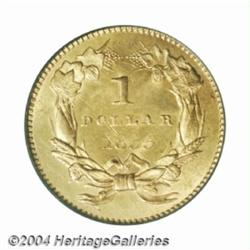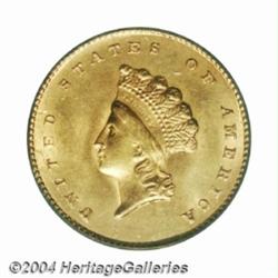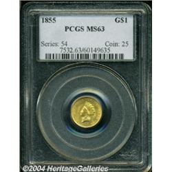 <table><tbody><tr><td><table> <TR><TD width="100%"><TABLE cellSpacing=1 cellPadding=3 width="100%" border=0><TBODY><TR><TD width="100%" bgColor=#79735c><FONT face=arial color=#ffffff size=3><B>Description</B> </FONT></TD></TR><TR><TD width="100%" bgColor=#ffffff><FONT face=arial size=2><B>1855 G$1 MS63 PCGS.</B></I> A highly desirable 1855 Type Two Gold Dollar in Mint State, this Select quality survivor exhibits uncommon sharpness of strike on the obverse. In fact, there is not a single ill-defined feature on that side, and we note particularly praiseworthy definition on the hair curls over Liberty's brow. The reverse is more typical of the type with softness of detail seen at the tops of the digits of the date, but we stress that the wreath is crisp and all design elements are at least discernible. Frosty in texture with medium intensity reddish-gold coloration and <I>no</B></I> mentionable clashmarks. Earmarked for inclusion in a Mint State type set. </FONT></TD></TR></TBODY></TABLE></TD></TR></TBODY></TABLE><BR><A name=PricesRealized></A><TABLE cellSpacing=0 cellPadding=0 width="100%" bgColor=#000000 border=0><TBODY><TR><TD width="100%"><TABLE cellSpacing=1 cellPadding=3 width="100%" border=0><TBODY><TR><TD width="100%" bgColor=#79735c><A name=PR><FONT face=arial color=#ffffff size=3><B>Previous Prices from Heritage Auctions</B> </FONT></A></TD></TR><TR><TD bgColor=#f6f6ed><TABLE cellSpacing=0 cellPadding=0 width="100%" border=1><TBODY><TR><TD align=middle width="33%"><B>Date</B></TD><TD align=middle width="33%"><B>Service</B></TD><TD align=middle width="33%"><B>Price</B></TD></TR><TR bgColor=whitesmoke><TD width="33%"><B>05/31/2003</B></TD><TD width="33%">PCGS</TD><TD width="33%">$10,235.00</TD></TR><TR bgColor=whitesmoke><TD width="33%"><B>01/05/2001</B></TD><TD width="33%">PCGS</TD><TD width="33%">$8,625.00</TD></TR><TR bgColor=whitesmoke><TD width="33%"><B>06/06/1998</B></TD><TD width="33%">PCGS</TD><TD width="33%">$18,400.00</TD></TR><TR bgColor=whitesmoke><TD width="33%"><B>08/02/1997</B></TD><TD width="33%">PCGS</TD><TD width="33%">$14,375.00</TD></TR><TR bgColor=whitesmoke><TD width="33%"><B>07/30/1994</B></TD><TD width="33%">PCGS</TD><TD width="33%">$11,000.00</TD></TR><TR bgColor=whitesmoke><TD width="33%"><B>10/01/1999</B></TD><TD width="33%">PCGS</TD><TD width="33%">$17,250.00</TD></TR><TR bgColor=whitesmoke><TD width="33%"><B>10/01/1999</B></TD><TD width="33%">PCGS</TD><TD width="33%">$16,100.00</TD></TR><TR bgColor=whitesmoke><TD width="33%"><B>06/01/1998</B></TD><TD width="33%">PCGS</TD><TD width="33%">$12,100.00</TD></TR><TR bgColor=whitesmoke><TD width="33%"><B>05/01/1994</B></TD><TD width="33%">PCGS</TD><TD width="33%">$9,350.00</TD></TR><TR bgColor=whitesmoke><TD width="33%"><B>08/01/1991</B></TD><TD width="33%">PCGS</TD><TD width="33%">$7,150.00</TD></TR><TR bgColor=whitesmoke><TD width="33%"><B>05/01/2001</B></TD><TD width="33%">PCGS</TD><TD width="33%">$11,500.00</TD></TR></TBODY></TABLE></TD></TR><TR><TD bgColor=#ffffff><FONT face=arial size=1 ?>PLEASE NOTE: All prices realized reflect the final hammer price PLUS the buyer's premium in auctions that charge a buyer's premium. Each item has a notation at the top of the listing indicating whether that lot included a buyer's premium. Example: A item that sells with a final hammer price of $100 and a 20% buyer's premium will display with a price realized of $120. All information listed is intended to be as accurate as possible, but errors are possible. Please use this guide carefully and inform us of any inaccuracies. </FONT></TD></TR></TBODY></TABLE></TD></TR></TBODY></TABLE><BR><TABLE cellSpacing=0 cellPadding=0 width="100%" bgColor=#000000 border=0><TBODY><TR><TD width="100%"><TABLE cellSpacing=1 cellPadding=3 width="100%" border=0><TBODY><TR><TD width="100%" bgColor=#79735c colSpan=6><FONT face=arial color=#ffffff size=3><B>Price Guide*</B> </FONT></TD></TR><TR bgColor=#f6f6ed><TD align=middle><B>Grade</B> </TD><TD align=middle><B>Coin World<BR>(Trends)</B> </TD><TD align=middle><B>Numismedia<BR>Retail</B> </TD><TD align=middle><B>Numismedia<BR>Wholesale</B> </TD><TD align=middle><B>Coin<BR>Universe</B> </TD><TD align=middle><B>Heritage<BR>Value Index</B> </TD></TR><TR bgColor=#ffffff><TD align=middle>62</TD><TD align=right>$6,500.00</TD><TD align=right>---</TD><TD align=right>$5,000.00</TD><TD align=right>$7,150.00</TD><TD align=right>$4,585.00</TD></TR><TR style="FONT-WEIGHT: bold" bgColor=#cccfdd><TD align=middle>63</TD><TD align=right>$15,000.00</TD><TD align=right>---</TD><TD align=right>$10,500.00</TD><TD align=right>$17,500.00</TD><TD align=right>$11,150.00</TD></TR><TR bgColor=#ffffff><TD align=middle>64</TD><TD align=right>$20,000.00</TD><TD align=right>---</TD><TD align=right>$16,550.00</TD><TD align=right>$24,000.00</TD><TD align=right>$15,366.67</TD></TR><TR bgColor=#ffffff><TD colSpan=6><FONT size=1>*All information listed is intended to be as accurate as possible, but errors are possible. No item may be returned or refused based on this information which is provided as a service to our customers. You should contact each pricing source directly to determine the accuracy of this information. </FONT></TD></TR></TBODY></TABLE></TD></TR></TBODY></TABLE><BR><TABLE cellSpacing=0 cellPadding=0 width="100%" bgColor=#000000 border=0><TBODY><TR><TD width="100%"><TABLE cellSpacing=1 cellPadding=3 width="100%" border=0><TBODY><TR><TD width="100%" bgColor=#79735c><FONT face=arial color=#ffffff size=3><B>Population Guide</B> </FONT></TD></TR><TR bgColor=#ffffff><TD align=middle><!-- Begin Output of Population Grid--><TABLE cellSpacing=0 cellPadding=0 width="100%" border=0><TBODY><TR><TD vAlign=center><TABLE cellSpacing=0 width="100%" border=1 cellsadding="3"><TBODY><TR><TD vAlign=center><TABLE cellSpacing=0 cellPadding=3 width="100%" border=1><TBODY><TR><TD vAlign=center align=middle bgColor=#f0f1e8 colSpan=2 <CENTER><FONT face=Arial size=2><B>PCGS Pop </B></FONT><CENTER></CENTER></TD><TD vAlign=center align=middl