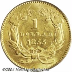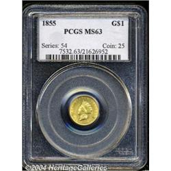 <B>1855<G$1> MS63 PCGS.</B></I> There are a few small marks scattered over each side, but none of singular importance. The striking details are typical for this issue, with somewhat weakly defined hair curls and date details, especially on the 8 in 1855. There is easily visible die clashing (as struck) evident on each side. A very bright, highly attractive example of this popular, short-lived series. Accompanied by ANACS certificate NCW121 as AU55/55.<BR><I>From The Willamette Collection.</B></I> <BR><BR><B>Important notice:</B> Heritage usually auctions material at the rate of 200-250 lots per hour. On some occasions eBay Live bid software or the Internet may not be able to keep up with the pace of the auction. We recommend placing a realistic absentee bid now as insurance to avoid disappointment. Occasionally the auctioneer may eliminate or reject an eBay Live bid, and the auctioneer may also reopen a lot after the close of the eBay live bidding (usually because we missed an audience bid), and may reject your bid even if it shows you as the winning bidder. By bidding via eBay Live, you agree that Heritage may award the lot to another bidder at its sole discretion under the circumstances described above or any other reasonable circumstances. Since eBay bids are not shown to us until we open the lot on the floor, we treat those bids just like floor bids. In most cases the floor responds before the eBay bid is presented to us, due to Internet lag time, so for consistency we have made it a policy that floor bids are always considered first over tie eBay live bids. Also please note that all Heritage lots purchased through eBay Live carry a 20% Buyer's Premium. Please make sure you read the Terms and Conditions before you bid. </span></font></tr></table></td></tr></table>