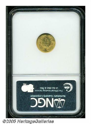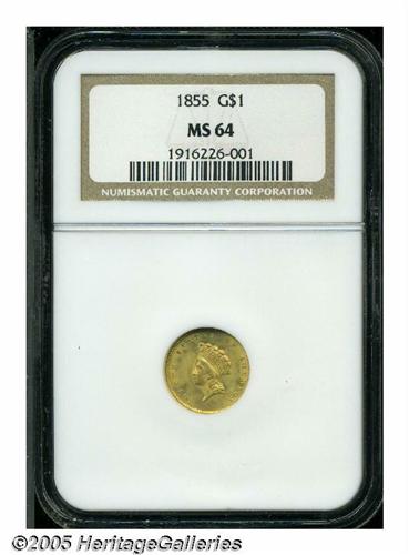 1855 G$1 MS64 NGC. A shimmering, well frosted rep