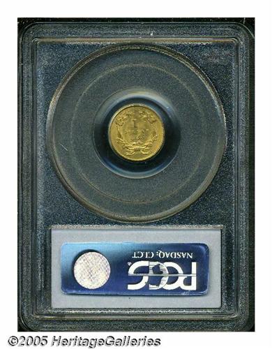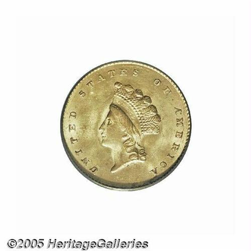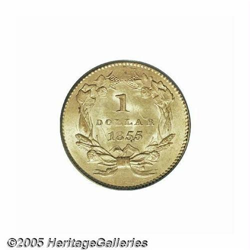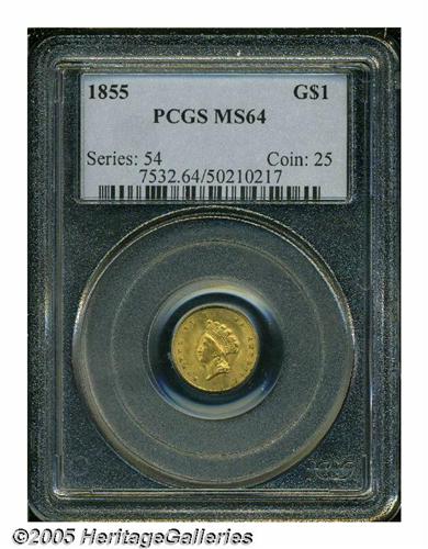 <B>1855<G$1> MS64 PCGS.</B></I> It is always an occasion of pride when we can offer a Type Two Gold Dollar of <I>any</B></I> issue that approaches the Gem threshold in terms of technical quality and aesthetic appeal. A gorgeous representative of the 1855 Philadelphia delivery, this satiny, almost matte-like survivor displays lovely honey-gold color with blushes of delicate golden-rose tinting in the centers. Close inspection with a loupe reveals a slightly grainy look to the finish. Clashmarks are noted in the fields around the centers, but both sides are expectantly free of most distracting abrasions for the assigned grade. The eye appeal of this coin could easily support a full Gem rating.