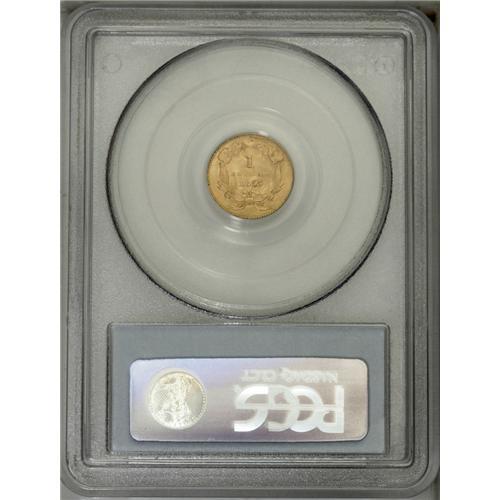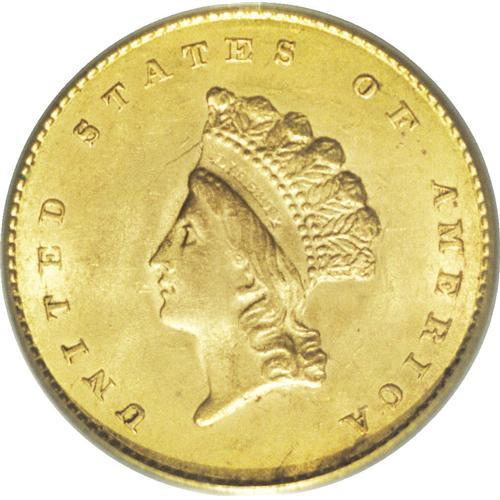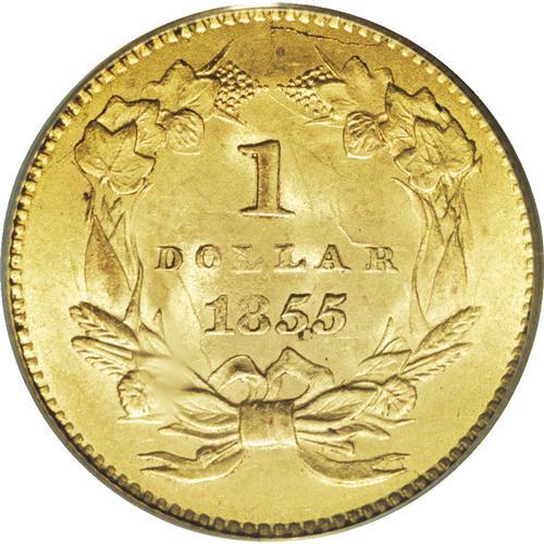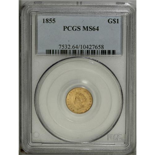 <B>1855 G$1 MS64 PCGS.</B></I> The 1855 dollar, with a mintage of 758,269 pieces, is one of the more available of the Type Two issues. It is comparable in mintage, and very close in rarity, to the 1854 Type Two. Jeff Garrett and Ron Guth, in the 2006 <I>Encyclopedia of U.S. Gold Coins, 1795-1933,</B></I> write that: "As population reports and auction records indicate, the 1855 is the slightly more rare of the two." The 1855 is often softly struck, especially in the central portions of the reverse, and extensive die clashing is not unusual.<BR> The near-Gem presented in this sale displays satiny luster and peach-gold patination imbued with subtle traces of light green. The strike is somewhat better than average, though a touch of softness is noted at the top of the 8 in the date and on the bottom of the first L in DOLLAR. Nice definition is seen in the Indian's bonnet and on the reverse wreath. Well preserved surfaces reveal moderate clash marks on both sides and a couple of spindly die cracks on the reverse.<BR><BR><b>Shipping:</b> Coin/Currency (<a target="_blank" href="http://www.heritageauctions.com/common/shipping.php">view shipping information</a>)