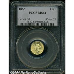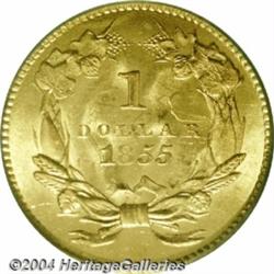 <B>1855<G$1> MS64 PCGS.</B></I> Booming cartwheel luster and a bold strike on the major devices combines with nearly undisturbed surfaces for pleasing eye appeal. Only the 8 in the date is not crisply impressed. Light clash marks on each side are strictly of mint origin, and are usually encountered on this ephemeral type coin. Except for the rare 1856-S, the Type Two Gold Dollar was produced for only two years, and there are simply not enough attractive Mint State examples to satisfy the demand from those collectors assembling type sets of gold coinage. The 1855 is also somewhat scarcer than the initial 1854 Type Two issue, probably due its lower mintage. <BR><BR><B>Important notice:</B> Heritage usually auctions material at the rate of 200-250 lots per hour. On some occasions eBay Live bid software or the Internet may not be able to keep up with the pace of the auction. We recommend placing a realistic absentee bid now as insurance to avoid disappointment. Occasionally the auctioneer may eliminate or reject an eBay Live bid, and the auctioneer may also reopen a lot after the close of the eBay live bidding (usually because we missed an audience bid), and may reject your bid even if it shows you as the winning bidder. By bidding via eBay Live, you agree that Heritage may award the lot to another bidder at its sole discretion under the circumstances described above or any other reasonable circumstances. Since eBay bids are not shown to us until we open the lot on the floor, we treat those bids just like floor bids. In most cases the floor responds before the eBay bid is presented to us, due to Internet lag time, so for consistency we have made it a policy that floor bids are always considered first over tie eBay live bids. Also please note that all Heritage lots purchased through eBay Live carry a 20% Buyer's Premium. Please make sure you read the Terms and Conditions before you bid. </span></font></tr></table></td></tr></table>