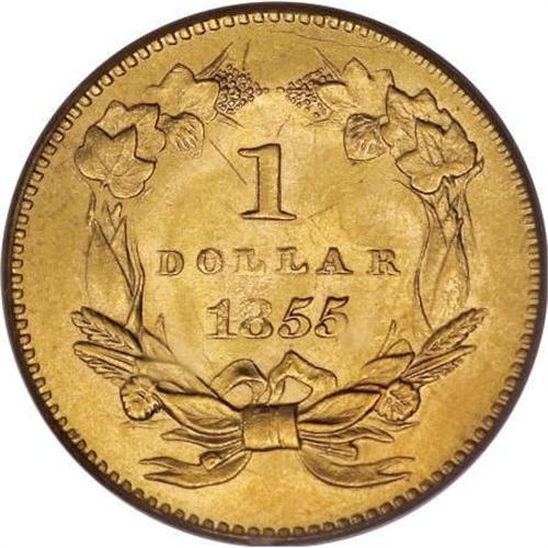 <B>1855 G$1 MS64 PCGS.</B></I> The Type II gold dollar was doomed to be a short-lived type. The design did not allow all of the reverse details to strike up properly, and the design also proved prone to die clashing. Clash marks are noticeable on the near-Gem example offered here, being most obvious on the obverse just behind Liberty's head. The piece is lustrous and boldly struck, with just a touch of the typical softness on LL in DOLLAR and 18 in the date. Surface blemishes are minimal, as lime-gold and orange colors merge together pleasingly on both sides. An attractive example of this brief type for the grade. <BR><BR><B>Coin Engraver:</B> James B. Longacre<BR><BR><b>Shipping:</b> Coins & Currency (<a target="_blank" href="http://www.heritageauctions.com/common/shipping.php">view shipping information</a>\)