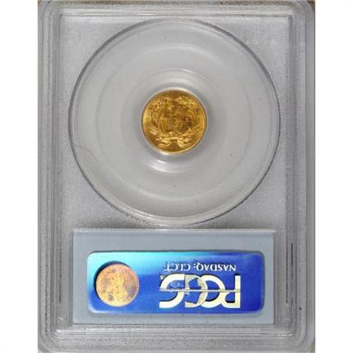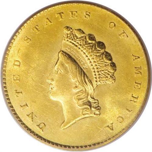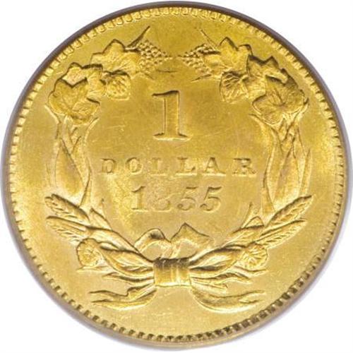 <B>1855 G$1 MS64 PCGS.</B></I> The 1855 gold dollar is available without difficulty in all grades up through MS63. In his volume I of reference works to United States federal gold coinage, Paul Taglione says of higher grade pieces that they are "quite rare from an <I>availability rarity</B></I> viewpoint if not necessarily from an <I>absolute rarity</B></I> one. In point of fact, it is one of the most demanded of all gold dollars but it stakes claim to absolute rarity only at the Mint State 65 or better level ... ."<BR> Ebullient luster issues from both sides of this near-Gem specimen, and a well directed strike imparts sharp definition to the design elements, except for the usual weakness in the top part of the 8 in the date. A few minor handling marks in the fields of the peach-gold surfaces define the grade.<BR><BR><B>Coin Engraver:</B> James B. Longacre<BR><BR><b>Shipping:</b> Coins & Currency (<a target="_blank" href="http://www.heritageauctions.com/common/shipping.php">view shipping information</a>)