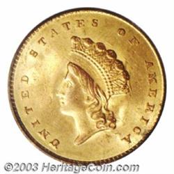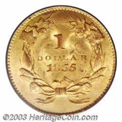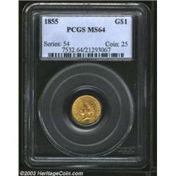 <TABLE cellSpacing=0 cellPadding=0 width="100%" bgColor=#000000 border=0><TBODY><TR><TD width="100%"><TABLE cellSpacing=1 cellPadding=3 width="100%" border=0><TBODY><TR><TD width="100%" bgColor=#79735c><FONT face=arial color=#ffffff size=3><B>Description</B> </FONT></TD></TR><TR><TD width="100%" bgColor=#ffffff><FONT face=arial size=2><B>1855 G$1 MS64 PCGS.</B></I> A Choice Brilliant Uncirculated Type Two Gold Dollar, this 1855-dated example is much scarcer in this grade than the similar 1854 coin. A light coating of satiny-gold tinting overlays both sides, each of which is boldly clashmarked (as struck) around the centers. The luster is warm and unusually attractive, and, although not abrasion-free, the surfaces do not reveal any singularly bothersome handling marks. Typically struck for the type with sharper definition toward the peripheries. </FONT></TD></TR></TBODY></TABLE></TD></TR></TBODY></TABLE><BR><A name=PricesRealized></A><TABLE cellSpacing=0 cellPadding=0 width="100%" bgColor=#000000 border=0><TBODY><TR><TD width="100%"><TABLE cellSpacing=1 cellPadding=3 width="100%" border=0><TBODY><TR><TD width="100%" bgColor=#79735c><A name=PR><FONT face=arial color=#ffffff size=3><B>Previous Prices from Heritage Auctions</B> </FONT></A></TD></TR><TR><TD bgColor=#f6f6ed><TABLE cellSpacing=0 cellPadding=0 width="100%" border=1><TBODY><TR><TD align=middle width="33%"><B>Date</B></TD><TD align=middle width="33%"><B>Service</B></TD><TD align=middle width="33%"><B>Price</B></TD></TR><TR bgColor=whitesmoke><TD width="33%"><B>08/09/2000</B></TD><TD width="33%">PCGS</TD><TD width="33%">$21,850.00</TD></TR><TR bgColor=whitesmoke><TD width="33%"><B>06/07/1997</B></TD><TD width="33%">PCGS</TD><TD width="33%">$23,100.00</TD></TR><TR bgColor=whitesmoke><TD width="33%"><B>08/01/1998</B></TD><TD width="33%">PCGS</TD><TD width="33%">$36,800.00</TD></TR><TR bgColor=whitesmoke><TD width="33%"><B>06/01/1996</B></TD><TD width="33%">PCGS</TD><TD width="33%">$25,300.00</TD></TR><TR bgColor=whitesmoke><TD width="33%"><B>09/01/1999</B></TD><TD width="33%">PCGS</TD><TD width="33%">$23,000.00</TD></TR><TR bgColor=whitesmoke><TD width="33%"><B>05/31/2001</B></TD><TD width="33%">NGC</TD><TD width="33%">$14,950.00</TD></TR><TR bgColor=whitesmoke><TD width="33%"><B>04/08/1994</B></TD><TD width="33%">NGC</TD><TD width="33%">$12,650.00</TD></TR><TR bgColor=whitesmoke><TD width="33%"><B>01/01/1994</B></TD><TD width="33%">NGC</TD><TD width="33%">$14,850.00</TD></TR></TBODY></TABLE></TD></TR><TR><TD bgColor=#ffffff><FONT face=arial size=1 ?>PLEASE NOTE: All prices realized reflect the final hammer price PLUS the buyer's premium in auctions that charge a buyer's premium. Each item has a notation at the top of the listing indicating whether that lot included a buyer's premium. Example: A item that sells with a final hammer price of $100 and a 20% buyer's premium will display with a price realized of $120. All information listed is intended to be as accurate as possible, but errors are possible. Please use this guide carefully and inform us of any inaccuracies. </FONT></TD></TR></TBODY></TABLE></TD></TR></TBODY></TABLE><BR><TABLE cellSpacing=0 cellPadding=0 width="100%" bgColor=#000000 border=0><TBODY><TR><TD width="100%"><TABLE cellSpacing=1 cellPadding=3 width="100%" border=0><TBODY><TR><TD width="100%" bgColor=#79735c colSpan=6><FONT face=arial color=#ffffff size=3><B>Price Guide*</B> </FONT></TD></TR><TR bgColor=#f6f6ed><TD align=middle><B>Grade</B> </TD><TD align=middle><B>Coin World<BR>(Trends)</B> </TD><TD align=middle><B>Numismedia<BR>Retail</B> </TD><TD align=middle><B>Numismedia<BR>Wholesale</B> </TD><TD align=middle><B>Coin<BR>Universe</B> </TD><TD align=middle><B>Heritage<BR>Value Index</B> </TD></TR><TR bgColor=#ffffff><TD align=middle>63</TD><TD align=right>$14,000.00</TD><TD align=right>---</TD><TD align=right>$10,000.00</TD><TD align=right>$13,000.00</TD><TD align=right>$9,356.25</TD></TR><TR style="FONT-WEIGHT: bold" bgColor=#cccfdd><TD align=middle>64</TD><TD align=right>$20,000.00</TD><TD align=right>---</TD><TD align=right>$15,225.00</TD><TD align=right>$21,000.00</TD><TD align=right>$14,096.67</TD></TR><TR bgColor=#ffffff><TD align=middle>65</TD><TD align=right>$42,500.00</TD><TD align=right>---</TD><TD align=right>$42,500.00</TD><TD align=right>$44,000.00</TD><TD align=right>$29,408.33</TD></TR><TR bgColor=#ffffff><TD colSpan=6><FONT size=1>*All information listed is intended to be as accurate as possible, but errors are possible. No item may be returned or refused based on this information which is provided as a service to our customers. You should contact each pricing source directly to determine the accuracy of this information. </FONT></TD></TR></TBODY></TABLE></TD></TR></TBODY></TABLE><BR><TABLE cellSpacing=0 cellPadding=0 width="100%" bgColor=#000000 border=0><TBODY><TR><TD width="100%"><TABLE cellSpacing=1 cellPadding=3 width="100%" border=0><TBODY><TR><TD width="100%" bgColor=#79735c><FONT face=arial color=#ffffff size=3><B>Population Guide</B> </FONT></TD></TR><TR bgColor=#ffffff><TD align=middle><!-- Begin Output of Population Grid--><TABLE cellSpacing=0 cellPadding=0 width="100%" border=0><TBODY><TR><TD vAlign=center><TABLE cellSpacing=0 width="100%" border=1 cellsadding="3"><TBODY><TR><TD vAlign=center><TABLE cellSpacing=0 cellPadding=3 width="100%" border=1><TBODY><TR><TD vAlign=center align=middle bgColor=#f0f1e8 colSpan=2 <CENTER><FONT face=Arial size=2><B>PCGS Pop </B></FONT><CENTER></CENTER></TD><TD vAlign=center align=middle bgColor=#f0f1e8 colSpan=2><CENTER><FONT face=Arial size=2><B>NGC Pop</B></CENTER></FONT></TD></TR><TR><TD vAlign=center><FONT face=Arial size=2>(64)</FONT> </TD><TD vAlign=center align=right><FONT face=Arial size=2>162</FONT> </TD><TD vAlign=center><FONT face=Arial size=2>(64)</FONT> </TD><TD vAlign=center align=right><FONT face=Arial size=2>96</FONT> </TD></TR><TR><TD vAlign=center><FONT face=Arial size=2>(>64)</FONT> </TD><TD vAlign=center align=right><FONT face=Ar