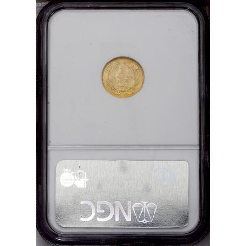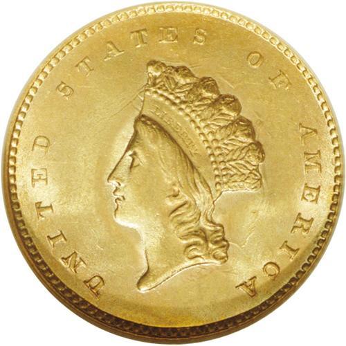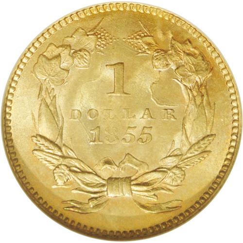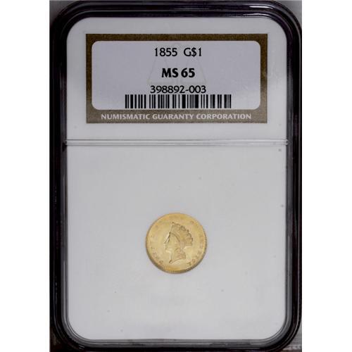 <B>1855<G$1> MS65 NGC.</B></I> This is an amazing Gem quality example, and highly desirable as such. The Type Two gold dollars, with the small Indian head motif, are rarely found in a condition even approaching the MS65 grade level. With the solitary exception of the digit 8 and the LL in DOLLAR, every design element is boldly defined. Even most of the hair strands adjacent to Liberty's face are sharply evident. Both sides exhibit heavy clash marks in the fields as almost always on these small gold coins. Such clash marks are a good sign, for they are a strong indication that the coin is a genuine product of the Mint. The surfaces have fully brilliant and frosty yellow-gold luster with considerable rich orange toning. The surfaces are nearly perfect, and are reminiscent of coins often seen today in even higher grades than this. Census: 29 in 65, 20 finer (1/06).