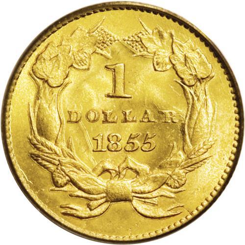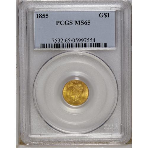 <B>1855 G$1 MS65 PCGS.</B></I> The Type Two gold dollar was a three-year production with a small Indian Head obverse design by James Longacre. The design change was associated with a slightly increased diameter intended to make these coins easier to handle by consumers. While the diameter remained constant for the remainder of the series through 1889, the obverse design was modified in 1856 due to striking characteristics. The highest relief of the obverse is the over Liberty's forehead down to the ear, and the depth of the die at this point created weakness at the opposing point of the reverse, including the date. This piece has clash marks on the reverse, including LIBERTY, that shows the exact location of the opposing points of the design, although the strike on this Gem is sharp enough that the design weakness is not immediately evident. This example has full mint brilliance with frosty yellow-gold luster. The surfaces are pristine and the eye appeal is exceptional.<BR><BR><b>Shipping:</b> Coin/Currency (<a target="_blank" href="http://www.heritageauctions.com/common/shipping.php">view shipping information</a>)