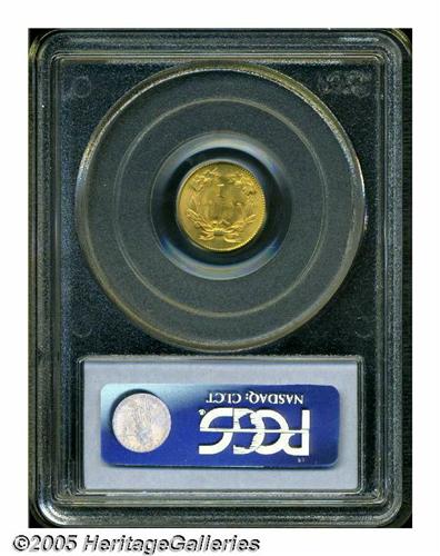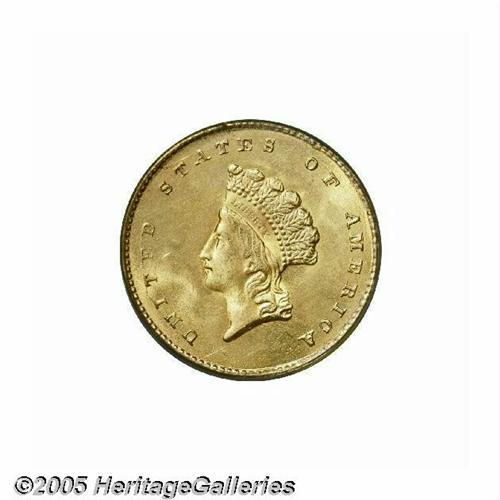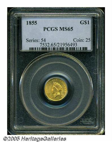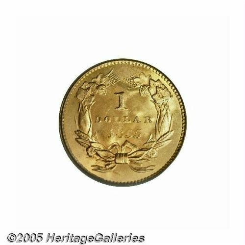 <B>1855<G$1> MS65 PCGS.</B></I> The desirability of this issue stems not from its absolute rarity, but from its status as one of only two gold dollars of the Type Two design that can be used for type purposes. The opportunity to offer a Gem quality 1854 Type Two or 1855 gold dollar is always a source of pride for us, and an occasion for serious consideration among our bidders. This coin presents an atypical "look" for the issue. The obverse is remarkably sharp in terms of striking quality, and neither side displays any overly distracting clashmarks. There is some bluntness of detail over the central reverse, but the wreath is sharp in all areas. Frosty and distraction-free, this coin's orange-gold color leaves little doubt as to its originality.