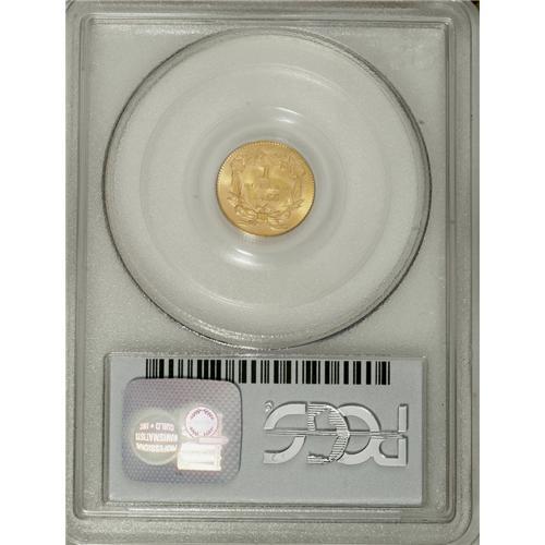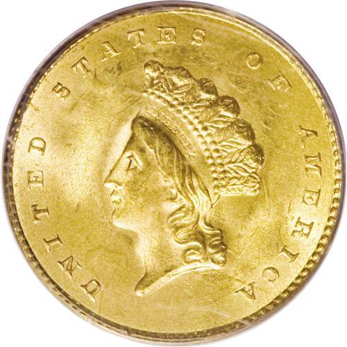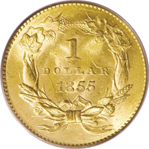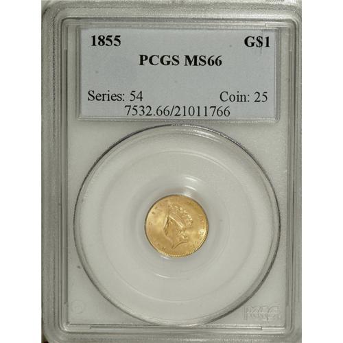 <B>1855 G$1 MS66 PCGS.</B></I> Diminutive yet precious, the gold dollar holds a special place in the hearts of many a collector. The denomination was born out of the flood of gold that came from California beginning in 1849, and the mint at Philadelphia and its branches began producing large quantities of gold dollars, which had their greatest commercial use on the West Coast but gained acceptance nationwide. Breen comments in his <I>Complete Encyclopedia</B></I> that from 1849 through 1854 "gold dollars formed the bulk of the nation's legal circulating medium between the 3c and the $2.50 denominations" as they were eagerly sought by the public as alternatives to the often worthless and unredeemable private bank notes and store scrip, both of which flooded the country as the value of gold and silver fluctuated. The little gold dollar was hardly worth melting, compared to the eagle, and was also highly useful, accounting for its broad acceptance in the 1850s. But the coin proved to be too easily dropped, and lost, in its initial version. Beginning in August 1854, a new, thinner but wider-diameter version appeared--what we today call the Type Two gold dollar. Liberty was replaced by a charming, feathered Indian princess--the first obeisance on national coinage to Native Americans, who were not to become a "national enemy" until the Indian Wars that followed the Civil War and intensified in the 1870s.<BR> It was Mint Director Snowden who requested the new design from his talented engraver, James Longacre, along with a "bigger sister," the three dollar gold piece. Longacre intended the image of Liberty to be a Romanesque version of the classic Venus (from a marble statue he saw in a Philadelphia museum) but the public saw the headdress and a classic was named. In fact, it became the inspiration for the Indian cent. The new style gold dollar, however, lasted only a matter of months. The government's set exchange rate, or the value ratio of gold to silver, could not be maintained, constantly threatening all gold pieces with private melting for profit. Many of those coins struck during the period of this type's manufacture (less than two years) failed to survive the decade, accounting in part for their rarity today. The style was elegant, a deft rendering of Liberty in her feathered bonnet, in noticeable high relief, but as Breen says "The coins proved unsatisfactory from the beginning. Longacre had miscalculated, overestimating the power of the coining presses then in use." It was a sheer manufacturing problem, especially for the Southern mints, which used older presses discarded by the main facility at Philadelphia. The coins most often were poorly struck, with weak features that wore quickly in use. Many were officially melted. The final type of this denomination, made beginning late in 1856, was the same size but in lower relief yet more deeply engraved, making the coins easier to produce with full details, and therefore they would endure far longer. What did not endure, in any number, were the Type Two issues--most of them unsharp to begin with, easily worn, and largely melted and re-coined into the new type. High grade survivors such as this exciting piece somehow escaped, and as such are miraculous reminders of those perilous days, all so long ago.<BR> The surfaces of this piece are exceptional in every regard, as indicated by the grade. The life of the coin, its luster, is thick and frosted. It is unbroken by the abrasions that usually accompany Type Two gold dollars. The striking details are also uncommonly sharp, with only the slightest hint of softness in the centers. The bright yellow-gold surfaces show a moderate overlay of light reddish patina. One of only 13 pieces so graded by PCGS with a mere three coins finer (3/07).<BR><I>From The Palakika Collection.</B></I><BR><BR><b>Shipping:</b> Coins & Currency (<a target="_blank" href="http://www.heritageauctions.com/common/shipping.php">view shipping information</a>)