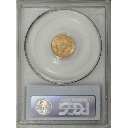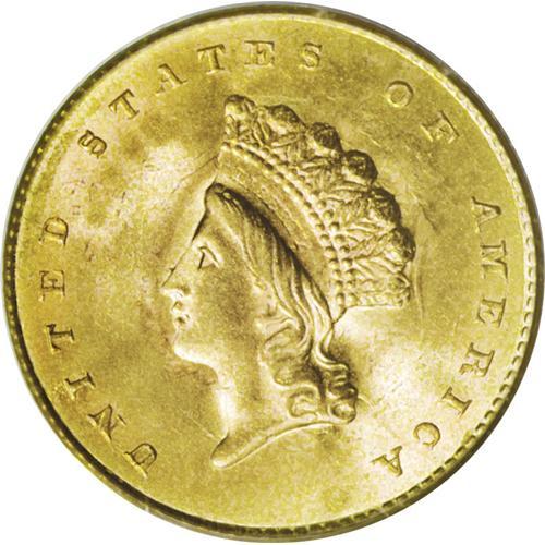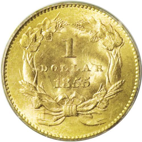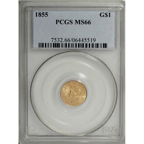 <B>1855 G$1 MS66 PCGS.</B></I> Both the 1854 and 1855 Type Two gold dollars were minted to the extent of a tad more than three-quarters of a million pieces each, and yet both are quite elusive in the higher Mint State grades. Their scarcity is largely due to the inappropriate design placement, putting the highpoints of each side in opposition. Type Two dollars are in demand chiefly from type collectors who desire to complete a U.S. type set, or a gold type set. Statistically, from the current combined NGC/PCGS population data, the 1855 shows a few more certified survivors in MS66 and finer grades than the 1854. Those services combined have certified 25 pieces of the 1855 in MS66, with seven pieces finer, while they have graded 17 examples of the 1854 in MS66, with five coins finer (11/06).<BR> From any technical or aesthetic point of view, this is a lovely and appealing coin, one that is instantly appealing. First Foremost, one must mention the lustrous and radiant surfaces, which are delightfully patinated in hues of orange-gold and green-gold, with glints of lilac and apricot predominating on the reverse. While the clash marks that are ubiquitous in the Type Two gold dollars are present here (and they do not affect the grade anyway), the surfaces are stunningly pristine and unencumbered by obvious signs of contact, large or small. The almost universal strike weakness of this type is here limited to trifling softness on Liberty's highpoint hair and the 8 in the date and LL in the denomination. Nonetheless a stunning and delightful example of this rare type. Population: 14 in 66, 3 finer (11/06).<BR><I>From The James Paul Collection.</B></I><BR><BR><b>Shipping:</b> Coin/Currency (<a target="_blank" href="http://www.heritageauctions.com/common/shipping.php">view shipping information</a>)