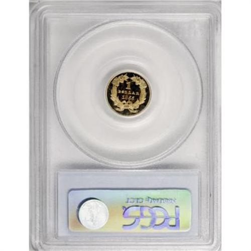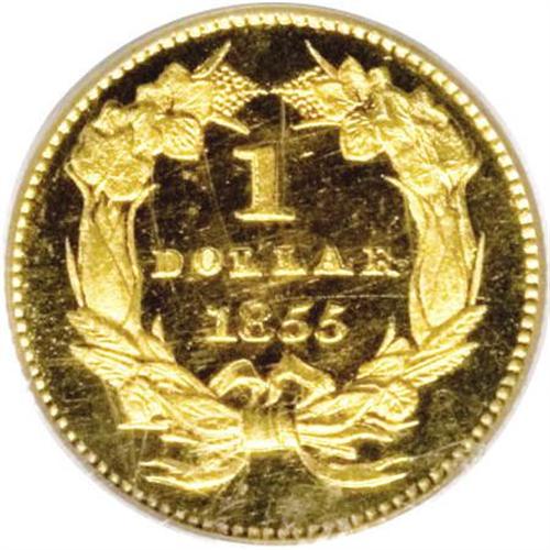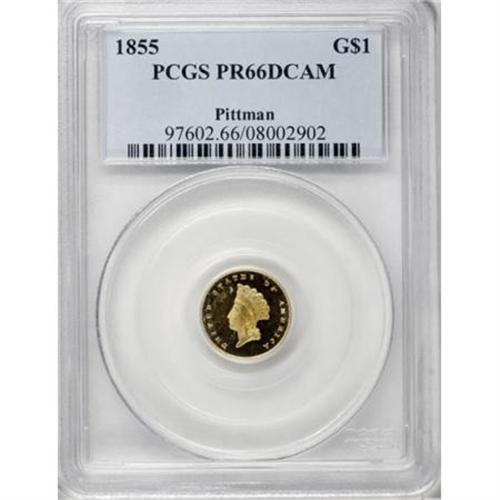 <B>1855 G$1 PR66 Deep Cameo PCGS.</B></I> Ex: Pittman. Alexander Hamilton's original 1791 vision for U.S. coinage comprised a gold dollar among other denominations. But no such denomination was produced in the 18th century, even though the nation made its first silver dollars in 1794, continuing through 1803. In the early 1830s the Bechtler family began minting gold dollars and other denominations from local North Carolina gold. Robert W. Julian, in an Oct. 20, 1982, <I>Coin World</B></I> article, wrote, "Treasury Secretary Levi Woodbury, as far back as August 1834 had considered the interesting idea of a gold dollar for the United States. Although the Mint officers at the time had thrown cold water on the idea, saying that gold pieces of this size had never been deposited at the Mint and they knew of no country where they circulated, nevertheless Woodbury persisted. In mid-January 1836 Chief Engraver Christian Gobrecht was instructed to drop all else and produce a pair of dies to strike pattern gold dollars." <BR> The "all else" that Gobrecht was instructed to drop included his work on designs for what would later be called the "Gobrecht" silver dollars dated 1836, 1838, and 1839 and based on work by the noted naturalist-artist Titian Peale and portrait painter Thomas Sully. The reintroduction of the silver dollar was a pet project of Mint Director Robert Maskell Patterson. Some of Patterson's objections to a gold dollar were likely due to his unswerving support of the silver dollar. Even after the Mint produced a few gold dollar patterns, dated 1836, the project came to naught. The first Gobrecht silver dollars entered circulation in 1836. Numerous pattern (and circulation strike) silver dollars followed through 1839--with restrikes extending over a period of perhaps several decades--and by 1840 the silver dollar was again firmly entrenched as a coinage denomination.<BR> A couple of times in the 1840s, proposals for a gold dollar resurfaced, yet Mint officials remained adamant in their opposition. The dynamics of bimetallism ultimately changed the situation in 1848, when the abundance of gold from the new California discoveries made silver dollars overpriced in relation to gold eagles. Silver dollars promptly disappeared from circulation and were widely hoarded, exported, and melted. This is one of many practical demonstrations in U.S. numismatic and economic history of Gresham's Law, in its simplest form saying that "Bad money drives out good money."<BR> By 1849 the need for a circulating medium (aside from paper scrip) forced the reluctant Mint to begin making gold dollars. The Type One pieces, produced from 1849 to 1854, were smaller in diameter and thicker than the Type Two dollars, produced only in 1854 through 1856. When James Ross Snowden took the helm as Mint director in 1853, he determined that the gold dollar should be larger in diameter and thinner, less similar in size to the much-lost "fish scale" silver three cent pieces introduced two years earlier. Mint Engraver James Longacre, who took the job upon Gobrecht's death in 1844, began work on a second gold dollar design. He used another incarnation of the so-called Indian Princess motif for the Type Two dollars, not unlike the one he used on the three dollar gold pieces introduced in 1854. Snowden requested that Longacre make the three dollar gold pieces of a distinct size, to eliminate any chance of confusion with half eagles or quarter eagles. Longacre then followed a proportional enlargement for the Type Two gold dollars, increasing their size from 0.50 inches (the Type One size) to 0.5625 inches.<BR> The Type Two pieces, troublesome and unsatisfying from the start, almost never struck up well. Even Uncirculated examples show blurry detail in Liberty's hair, the LL in DOLLAR, and the 85 in the date--if not the entire date. The highpoints of the obverse, directly opposed to the date and denomination on the reverse, ensured that both the design and the singular information quickly wore to illegibility in circulation. After only three years the Mint changed the design again, this time with an obverse and reverse that strived to avoid putting high relief areas in direct opposition.<BR> Because of their difficult design and the enduring popularity of gold type collecting, Type Two gold dollars in high grades have emerged as prime gold rarities. The 1854 and 1855 gold dollars were the first and only P-mint gold dollars produced with the Type Two Indian Princess design. Each issue saw a fairly sizeable number of business strikes--more than 783,000 pieces of the 1854 and 758,000 examples of the 1855--but only an extremely small number of proof gold coins were minted. In 1855 proof coinage were still playthings of the wealthy and well-connected: It would be another three years, in 1858, before the Mint began widely advertising proof coins for sale to the public.<BR> Among 19th century proof gold, few type coins are rarer or more desirable than the Type Two gold dollar. Because of the difficulty of finding high grade, well-struck-up pieces, collectors with available funds turn to proof Type Two gold dollars as a more than acceptable alternative to mushy business strikes. Proofs are immediately recognizable when encountered: The deeply mirrored fields and crisp details allow no confusion with circulation strikes. About eight to 10 examples are known today: NGC and PCGS together account for 11 examples in all grades, undoubtedly including resubmissions. <B>This coin is the finest and only PR66 Deep Cameo at PCGS, with none finer (11/07).</B></I> NGC shows one PR66 Cameo, one PR66 Ultra Cameo and one PR66 <B><img src="/images/star.gif" width="10" height="10" alt="" border="0"></B></I> Ultra Cameo, all 1855s, as the finest graded for the entire subtype. <BR> The coin shows smooth, mirrored looking-glass fields and thick frost on the devices, with superlative black-on-gold contrast. A couple of tiny planchet flakes are seen on the reve