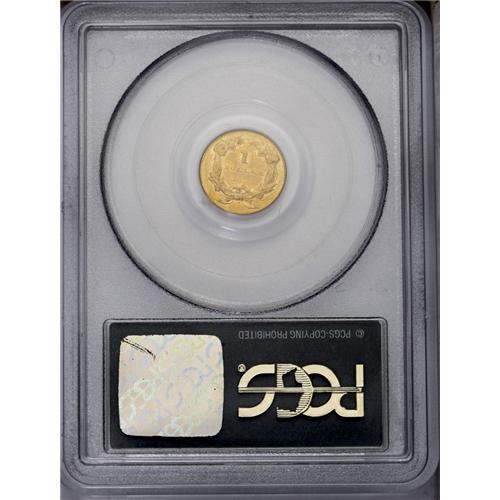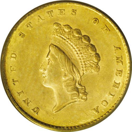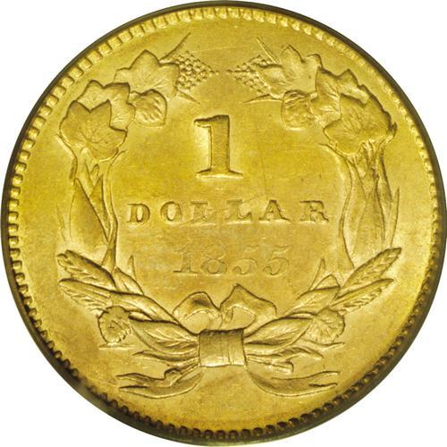 <B>1855 G$1 Type Two MS60 PCGS.</B></I> The strike is better than might be expected for this difficult type coin, with good detailing on the feathers, on LIBERTY, and on the wreath. Weakness is largely confined to the date and the hair at Liberty's forehead and temple. A pretty mix of peach and orange-gold and lime-green patina bathes each side. Minor handling marks are most noticeable on the reverse.