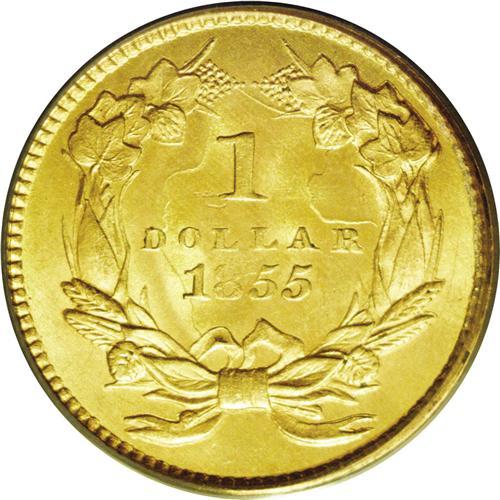 <B>1855<G$1> Type Two MS64 PCGS.</B></I> This beautiful near-Gem coin is an incredibly scarce and desirable example of the short-lived Type Two design, the scarcest gold type coin excluding early gold. Brilliant cartwheel luster radiates from the near-pristine, shimmery surfaces. The color is a pretty, original honey-gold. The strike is enormously pleasing, with excellent definition on the headdress tips, the peripheral legends, and the wreath. Only the two L's in DOLLAR and the 8 in the date show singular weakness. Both sides are boldly clashed, as is characteristic for the type. This coin would fit quite nicely into a Gem gold type set (and not require upgrading) at a fraction of the price. PCGS has graded 47 finer (3/06). <BR><BR><B>Important notice:</B> Heritage usually auctions material at the rate of 200-250 lots per hour. On some occasions eBay Live bid software or the Internet may not be able to keep up with the pace of the auction. We recommend placing a realistic absentee bid now as insurance to avoid disappointment. Occasionally the auctioneer may eliminate or reject an eBay Live bid, and the auctioneer may also reopen a lot after the close of the eBay live bidding (usually because we missed an audience bid), and may reject your bid even if it shows you as the winning bidder. By bidding via eBay Live, you agree that Heritage may award the lot to another bidder at its sole discretion under the circumstances described above or any other reasonable circumstances. Since eBay bids are not shown to us until we open the lot on the floor, we treat those bids just like floor bids. In most cases the floor responds before the eBay bid is presented to us, due to Internet lag time, so for consistency we have made it a policy that floor bids are always considered first over tie eBay live bids. Also please note that all Heritage lots purchased through eBay Live carry a 20% Buyer's Premium. Please make sure you read the Terms and Conditions before you bid. This lot is being auctioned in conjunction with a live floor auction by Heritage Galleries & Auctioneers. All final auction and invoice information will be supplied by Heritage Galleries & Auctioneers, and all other information should be considered preliminary. Lot:2284 <BR><BR><B>Winning Notification and Billing:</B> After the FINAL session in this auction is complete, Heritage will send e-mail and snail mail invoices. This process normally takes several days. All final auction and invoice information will be supplied by Heritage Galleries & Auctioneers, and all other information should be considered preliminary. <BR><BR>This auction will be conducted on a live auction floor and over the Internet through eBay Live. If you choose to place an absentee bid, please take a moment to <font color='#0000ff'><u><a href='http://pages.ebay.com/liveauctions/help/before/laabsentee.html'>learn how eBay Live absentee bidding works</a></u></font><font color='#000000'>