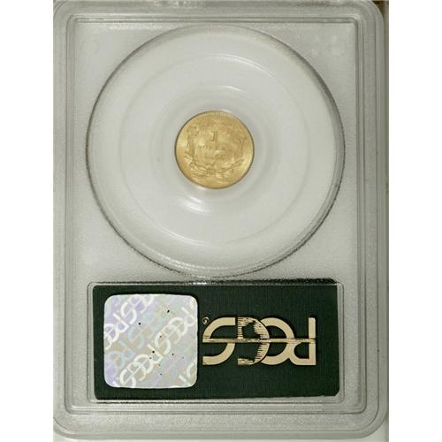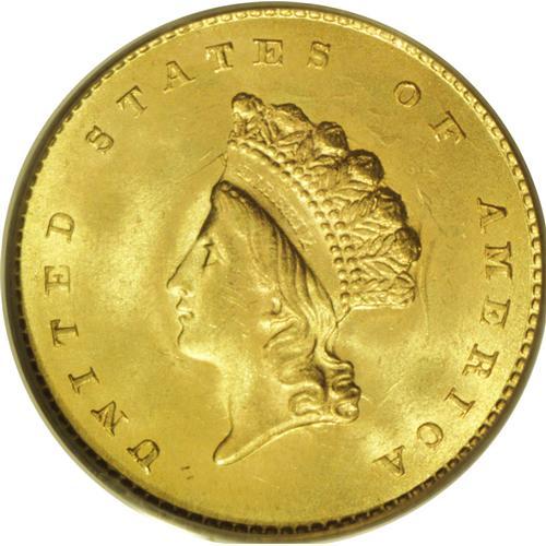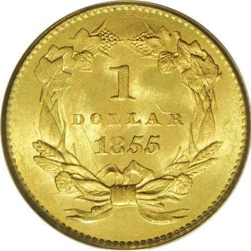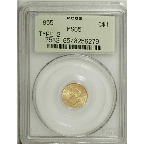 <B>1855 G$1 MS65 PCGS.</B></I> Several hundred 1855 gold dollars have been certified by PCGS and NGC through MS64. A significant drop in the population occurs at the Gem and finer levels of preservation, where fewer than 100 coins have been seen. This fabulous MS65 specimen displays outstanding luster and a mix of yellow-gold, mint-green, and light tan coloration. The design features are well brought up, except for minor softness in the top of the 8, which is typical for the issue. Well preserved surfaces exhibit light clash marks on each side. Population: 36 in 65, 17 finer (11/06).<BR><BR><b>Shipping:</b> Coin/Currency (<a target="_blank" href="http://www.heritageauctions.com/common/shipping.php">view shipping information</a>)