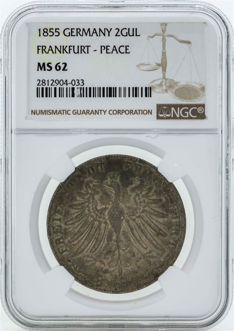 One 1855 Germany 2 Gulden Coin NGC MS62. NGC Certified.
