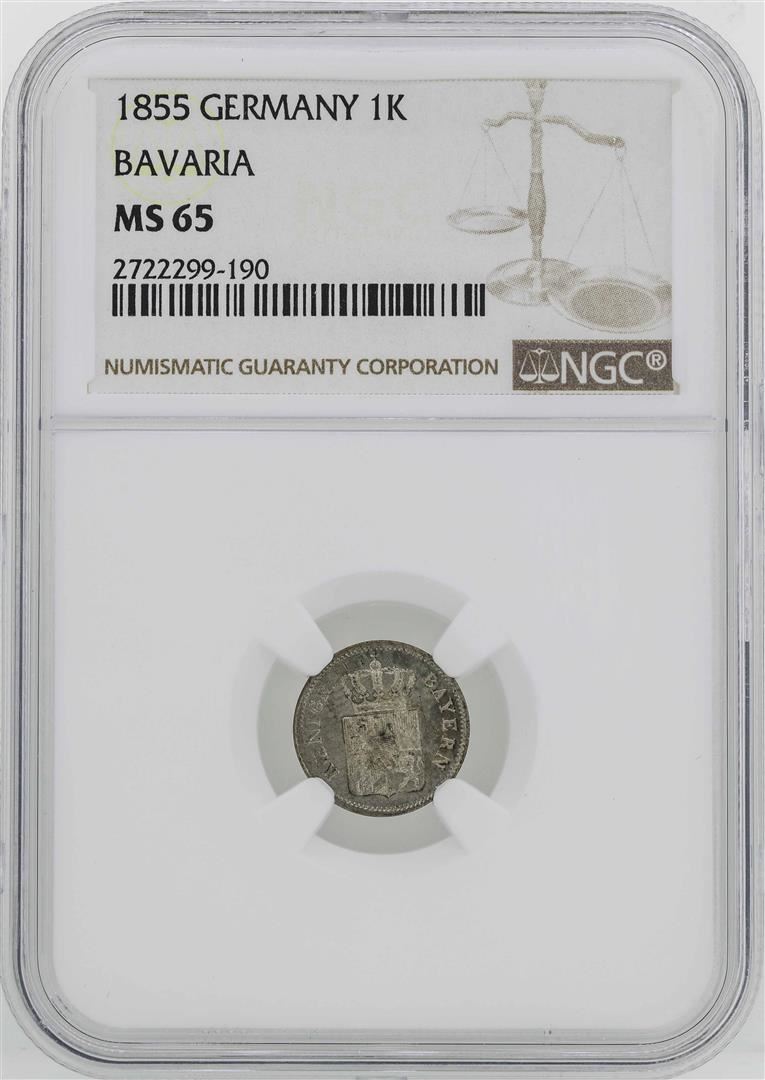 One 1855 Germany Bavaria Kreuzer Coin NGC MS65. NGC Certified.