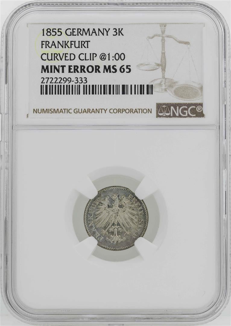 One 1855 Germany Frankfort 3 Kreuzer Coin Mint ERROR Curved Clip NGC MS65. NGC Certified.
