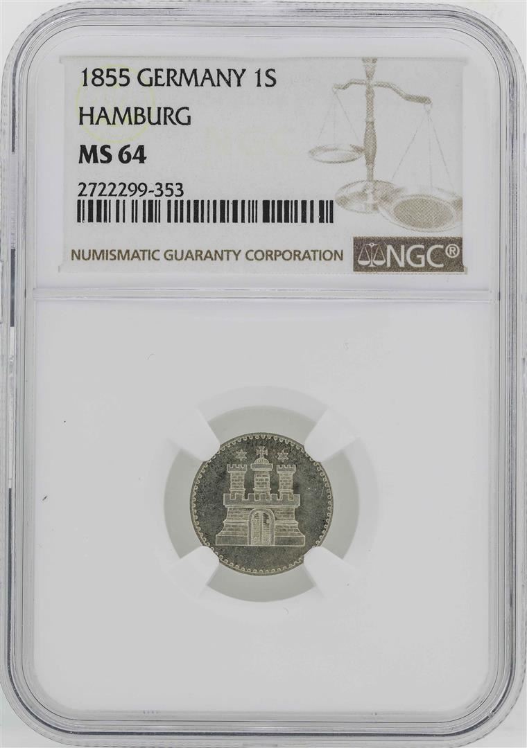 One 1855 Germany Hamburg Schilling Coin NGC MS64. NGC Certified.
