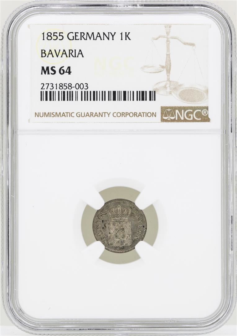 One 1855 Germany Kreuzer Bavaria Coin NGC MS64. NGC Certified.