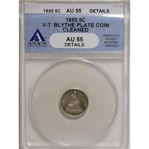 <B>1855 H10C Arrows, Blythe Plate--Cleaned--ANACS AU55 Details.</B></I> V-7. NGC Census: (8/184). PCGS Population (10/138). Mintage: 1,750,000. Numismedia Wsl. Price for NGC/PCGS coin in AU55: $121. (#4360)<BR><I>From The Al Blythe Collection of Half Dimes.</B></I><BR><BR><B>Coin Engraver:</B> Christian Gobrecht<BR><BR><b>Shipping:</b> Coins & Currency (<a target="_blank" href="http://www.heritageauctions.com/common/shipping.php">view shipping information</a>)
