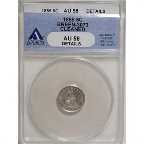 <B>1855 H10C Arrows--Cleaned--ANACS AU58 Details.</B></I> Breen-3073. NGC Census: (20/164). PCGS Population (26/112). Mintage: 1,750,000. Numismedia Wsl. Price for NGC/PCGS coin in AU58: $135. (#4360)<BR><I>From The Al Blythe Collection of Half Dimes.</B></I><BR><BR><B>Coin Engraver:</B> Christian Gobrecht<BR><BR><b>Shipping:</b> Coins & Currency (<a target="_blank" href="http://www.heritageauctions.com/common/shipping.php">view shipping information</a>)
