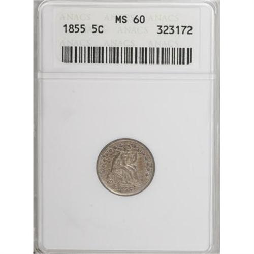 <B>1855 H10C Arrows MS60 ANACS.</B></I> V-3. NGC Census: (0/166). PCGS Population (1/109). Mintage: 1,750,000. Numismedia Wsl. Price for NGC/PCGS coin in MS60: $154. (#4360)<BR><BR><B>Coin Engraver:</B> Christian Gobrecht<BR><BR><b>Shipping:</b> Coins & Currency (<a target="_blank" href="http://www.heritageauctions.com/common/shipping.php">view shipping information</a>)